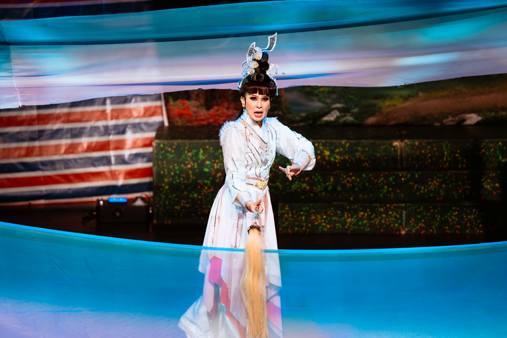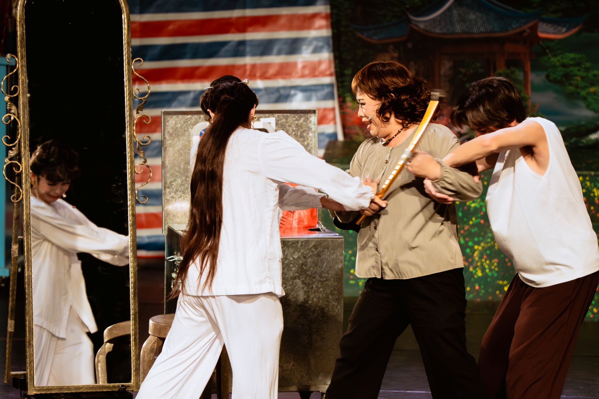 在形式方面,明華園星字團也有嶄新的嘗試,舞台設計為戲台前後交融一處,戲箱、戲服揭示為戲後台空間,後方以一處高台作為戲中戲的戲台,有時也將演員唱歌仔戲場景投影在布幕上,營造從後台往台前看的影像,也是對過往阿嬤演出的想像。這樣戲台前後交融一處的設計,猶如台前台後緊密交織的人生,劇中主要有兩個戲中戲段落,其一為團長演出《薛丁山》,再現當家小生的氣勢以及懷有身孕仍須演出的艱辛;其二為母女衝突的《水淹金山》,多數戲中戲形式的呈現大多與劇情維持一種隱約的呼應與連結,這齣戲則是讓戲中戲反過來影響或決定劇中演員的人生,讓人生與戲更直接辛辣地雜揉一處。