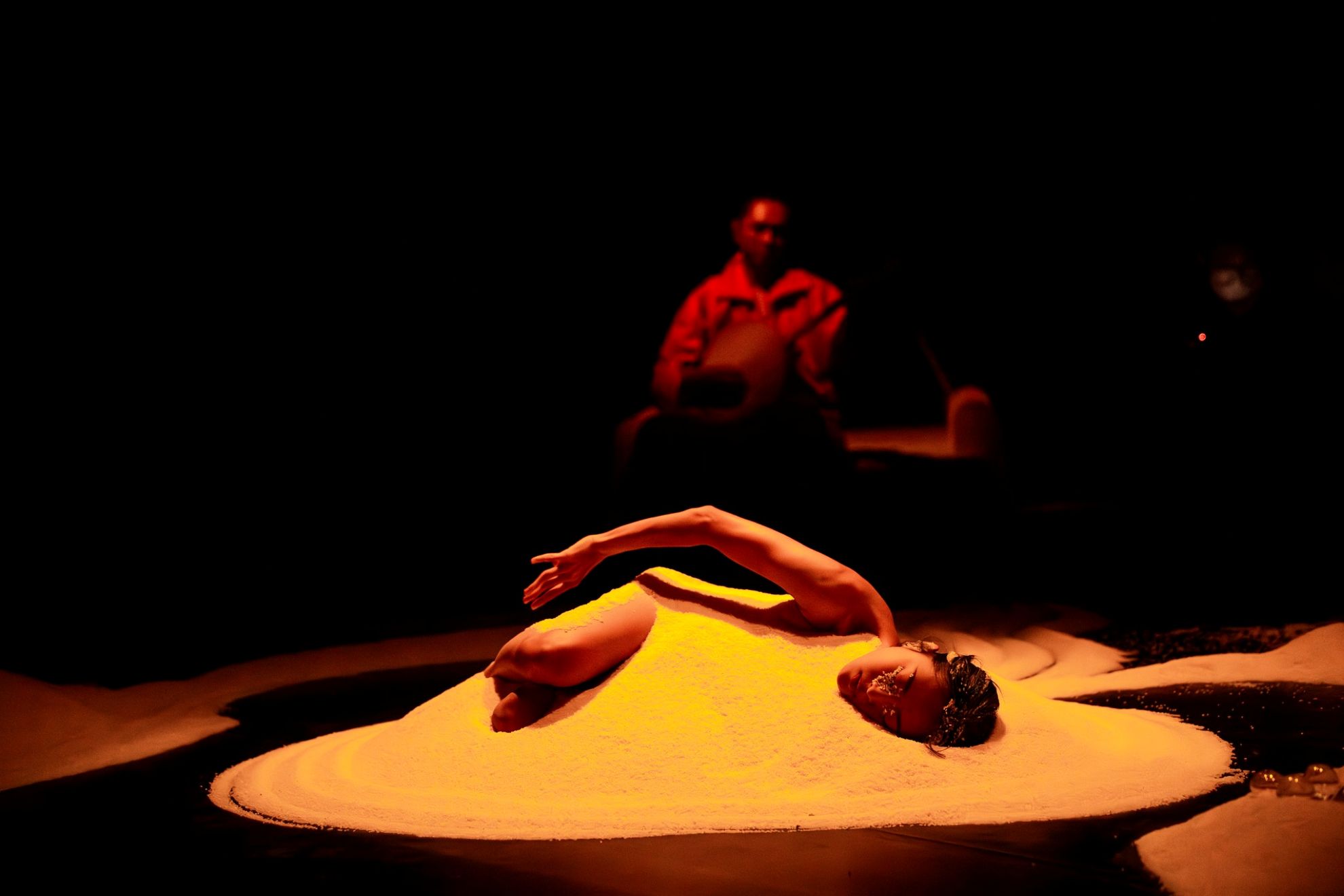 在此,我們進入第二階段,到處也是形成圖紋的米堆,中央有個較為高聳,露出一塊彷彿肉質的東西,還帶有兩個小凸起。觀眾端在椅子上,說書人提示大家,米堆裏發亮的小圓瓶可拾起飲用,是比擬於林投姐的眼淚,內容物是通寧水,大概是取通靈的諧音,一個妙趣的設置。隨後,說書人開始他唱腔迷人的《無界》(林奕碩編曲),帶有古調的新譜,歌詞讓人沉浸在「無山海、無河川、無東無西、無星宿、無塵界、無空與無間」等萬物皆空的無境。回想起來,這段歌曲有咒語意象,時候到了,便能催醒米堆裏怪異女體的甦活;舞者鄒瑩霖,藏身其中,當米粒微有動靜,逐漸崩落,肢體便逐次浮現,從緩緩起身到完全現身,但地面是她所有舞蹈動作的支撐與歸返之所,而地到底有多深?我們難以知道,只有她能。至於頭臉,身份表徵與辨識的要項,變得不太顯著,反而是四肢與軀幹,是米堆裏的還魂儀式;她轉腿一掃,幾乎把米粒潑撒到觀眾身上,定神一看,她的肉身是錯位的器官與解剖學:乳頭長在屁股上,一條像是脊椎,由七個鼻子串接而成,從胸口延伸到下腹部。這副身軀,不正意味著官能的倒錯,是嗅覺、肉慾、情慾、生殖、哺乳與口腔慾等聯結,一種不止歇又跨器官的官能流動——尤其是肩負呼吸與嗅覺品味的鼻子,在此不再是被人品味的物件,而是自己通透全身的機能,主動去品味這個世界。於是,「無界」不是佛教所謂的空性(śūnyatā)或涅槃(Nirvāṇa),因為這個視角跟《林投姐》不對盤,甚至也無關於民俗傳說的復仇版本,跟鬼故事或冤魂不散的題旨也脫鉤,但若還要說它有所牽連,則是全然的轉化她命運的乖舛:沒有界域的女體,她的異能量——這能量,正是通過舞蹈,由「何曉玫MeimageDance」所編,是林投姐她生前未曾有過的姿態,至少歷史或傳說上都未有紀載過,且即使她有舞過,也不會是這種舞蹈。