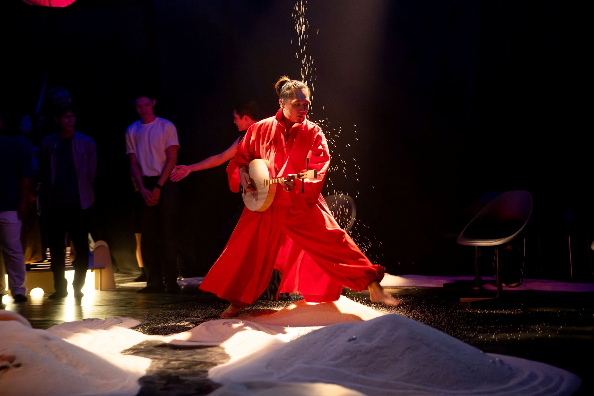 沒多久,工作人員要求觀眾卸下個人隨身包與鞋襪,放入備妥的囍字搪瓷臉盆,穿上製作單位提供的黑襪,在紙片上簽署自己姓名,並交給工作人員,說書人(曾伯豪)據此說道:忘掉你自己。他引導大家圍成圈,端看中央有個道具,奇特的小模型,並邀請每人從中拾一把米,握在手裏;他說了些話,並詢問觀眾,認為人生裏的愛情是快樂還是痛苦居多?顯然回答不太重要,因為從空間樣式、引導者的服裝到舉止都是特定氛圍的塑造,俱足儀式感,也是在地傳說或民俗信仰等符碼的有意鋪陳。