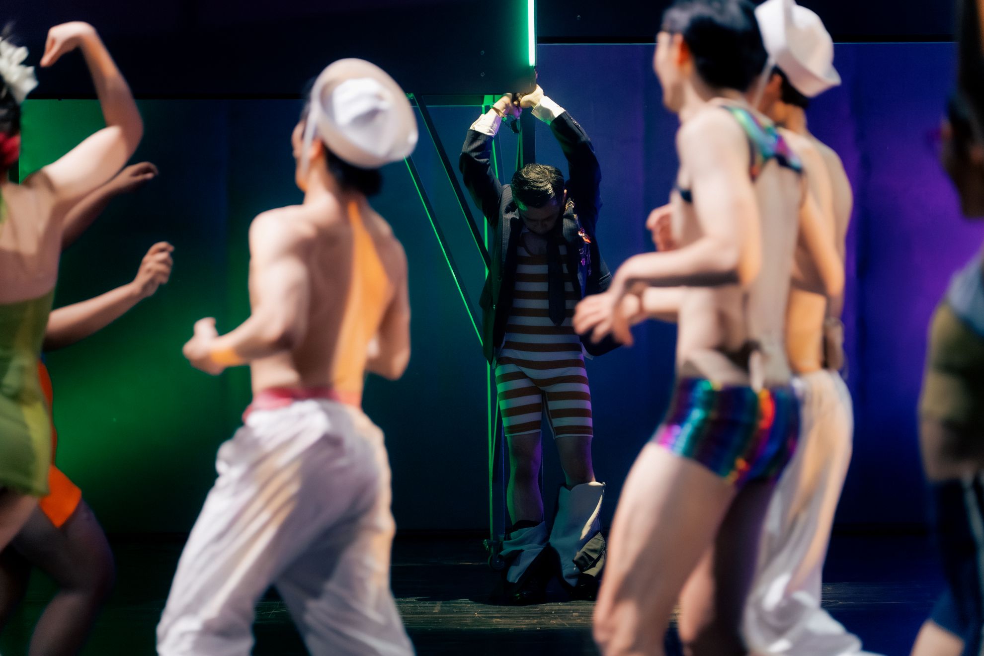 聚焦在情色展演而不是感官慾望的表演形式。戲中的性愛場景直接舞蹈化,或善用芭樂情歌的隱喻。工程師太太們穿著很辣的洋裝,熱舞時非常性感,但服裝的安全措施相當完善,讓筆者可以安心聚焦在肢體表現上。反而是生理男性演員們輪流脫衣服,開場時穿著厚厚工作服,一度以近似變裝皇后的造型登場,整齣戲反覆出現BL曖昧和猛男秀場氛圍,對原作中的男性凝視開起玩笑。《帝克斯》情色展演的核心,與其說是性愛,更像是一種愛情關係裡的性別認同問題。於是,情色展演具有了性別認同與個人覺醒的深層意涵。