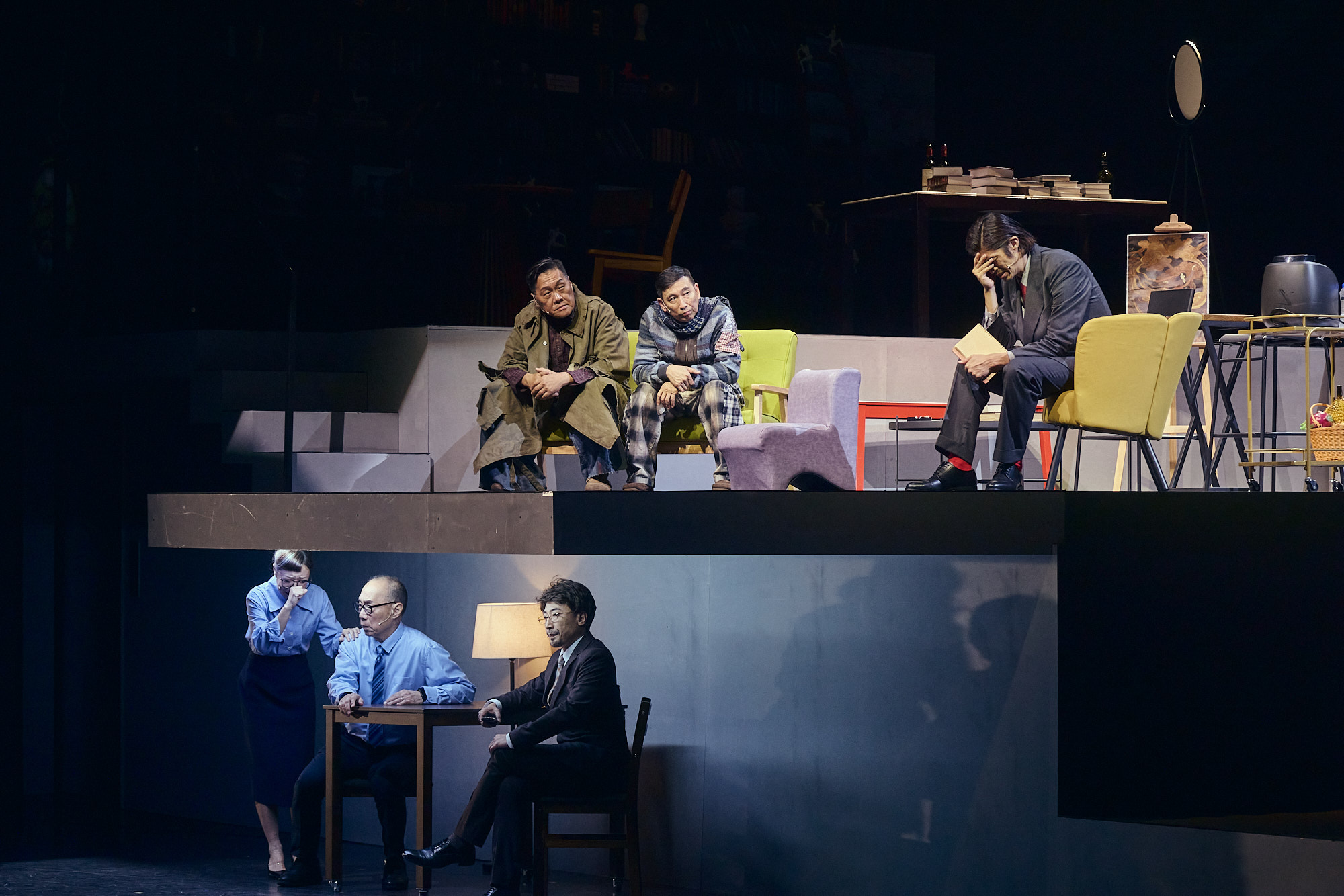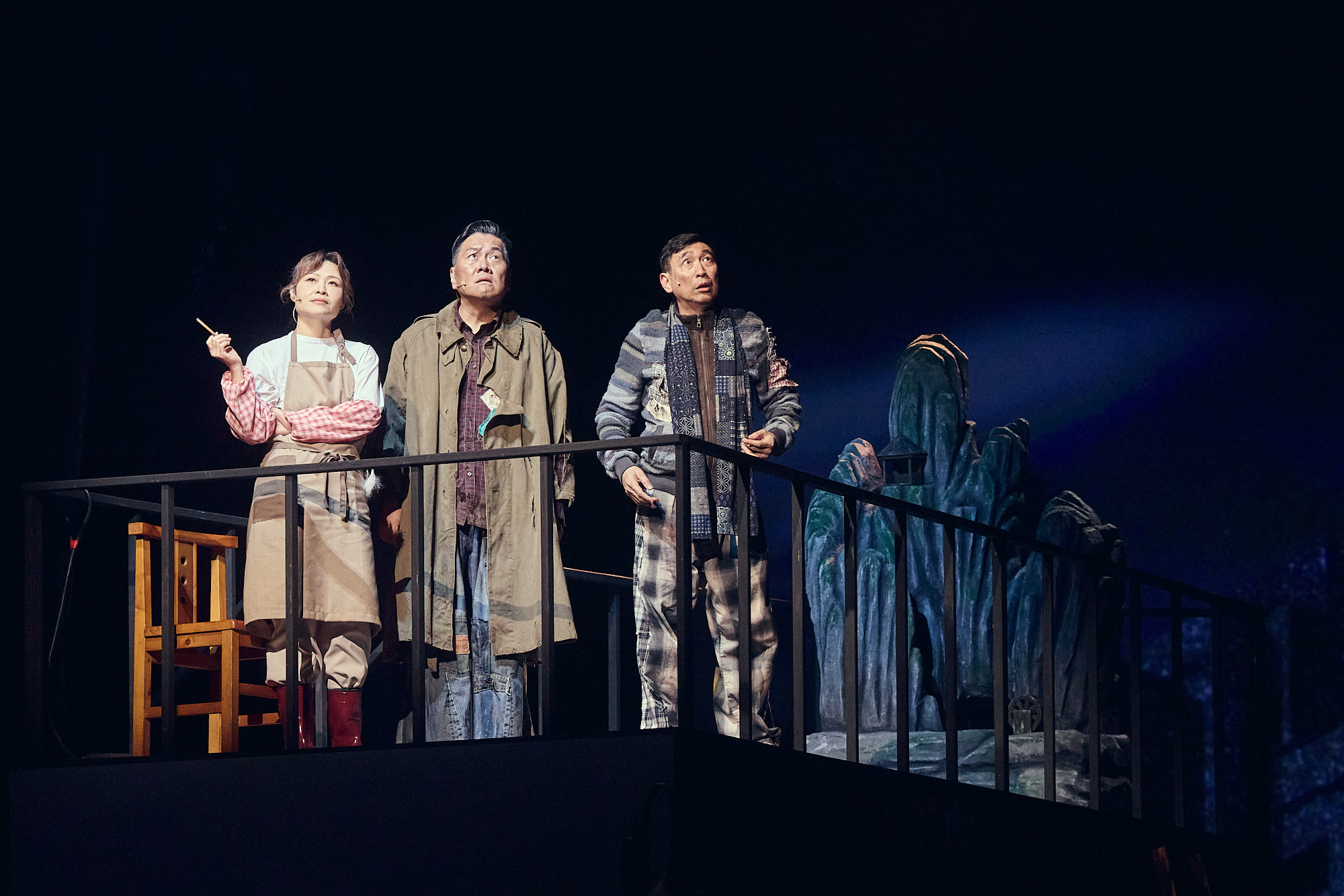 導演的場面調度,受到舞台空間規劃的影響,在上下前後之間的轉換,顯得侷促,而有許多滯礙的情形。演員的整體表現,令人失望。許瑋甯(飾天總),頂著影后光環,卻只能依靠誇張的手勢和語氣,試圖掌握偌大的舞台空間,效果不佳,更犧牲了角色本來應有的細膩情感轉折。朱德剛(飾江)、宋少卿(飾山)兩位資深演員的表演方法,表面看似流暢無礙,卻給人情感空洞之感,特別是他們在開場時的引經據典,也就是當代網民熱衷轉貼分享的「金句連發」,不似兩位智者信手捻來的機鋒對話,卻像是播放預錄的對白台詞。其他演員,無論是單飾一角或分飾多角,多只有功能性的存在,甭論人物刻畫或情感表達,浪費了中青世代優秀演員的舞台能量,殊為可惜。