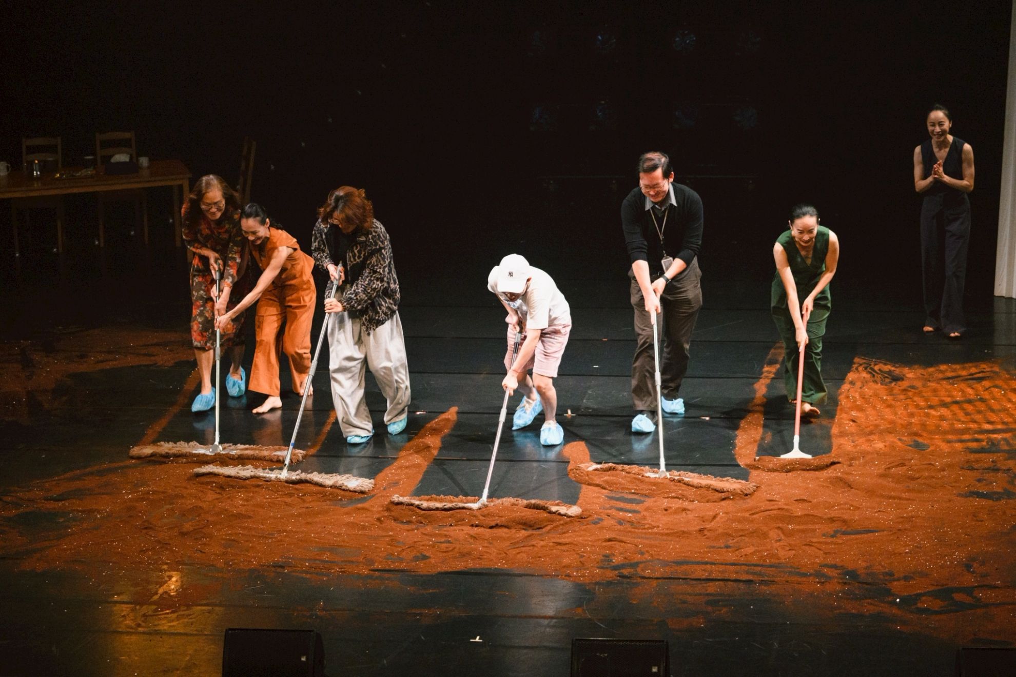 舞台上,一名表演者持黃色的鏟子,將透明收納箱內的咖啡粉緩緩播撒,空氣中開始瀰漫著乾燥的香氣。另一名表演者以極其緩慢且專注的姿態,將地板上的粉末細緻地勻配開來。而她使用的工具,是舞台專用的地面拖把,這讓日常的清掃動作,在舞台上瞬間轉化為儀式。