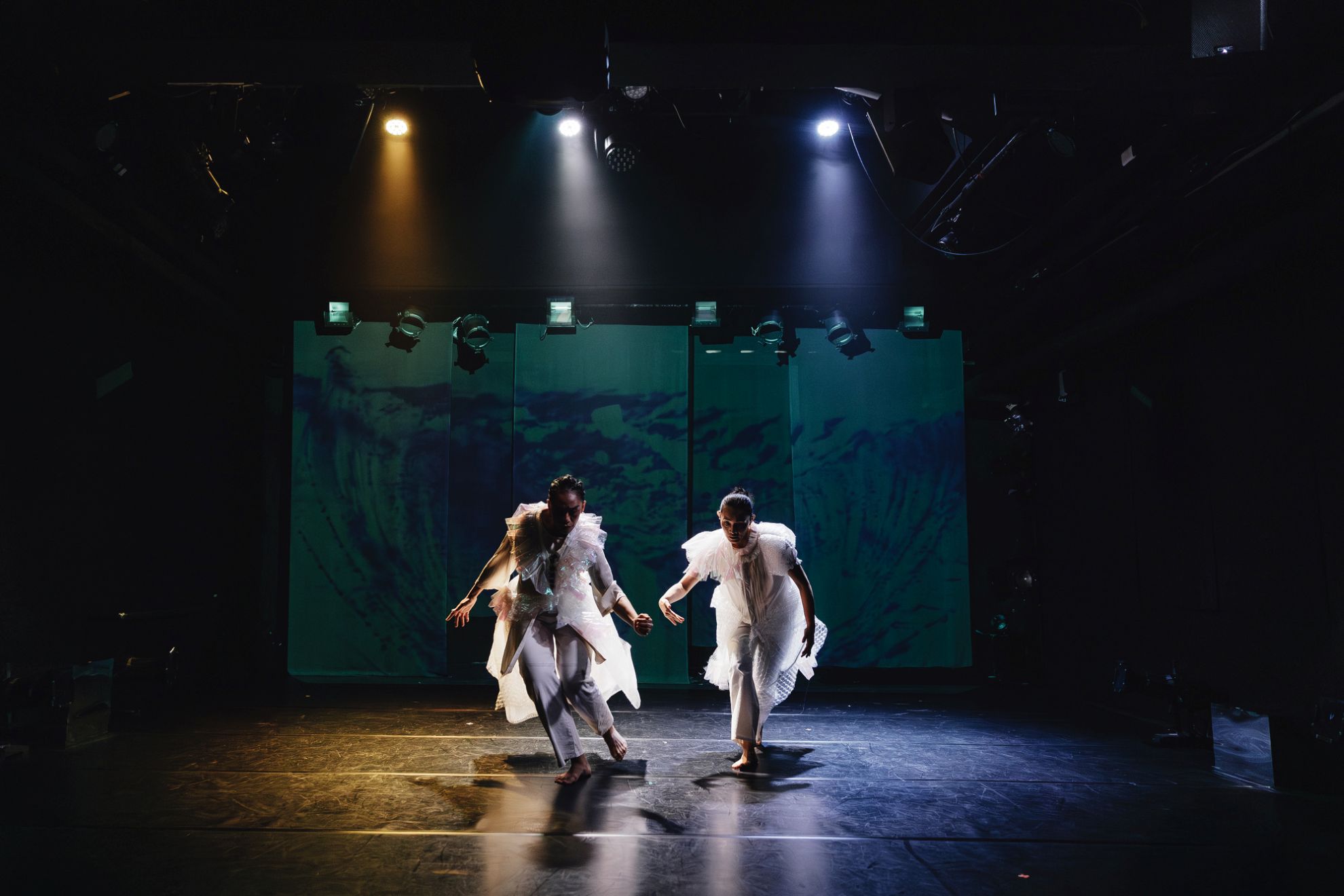 褪去光的迷幻效果後,我們看見兩名女子,一身白衣,下半身拖曳著一把紗尾,如縷傾訴人魚公主的身世。