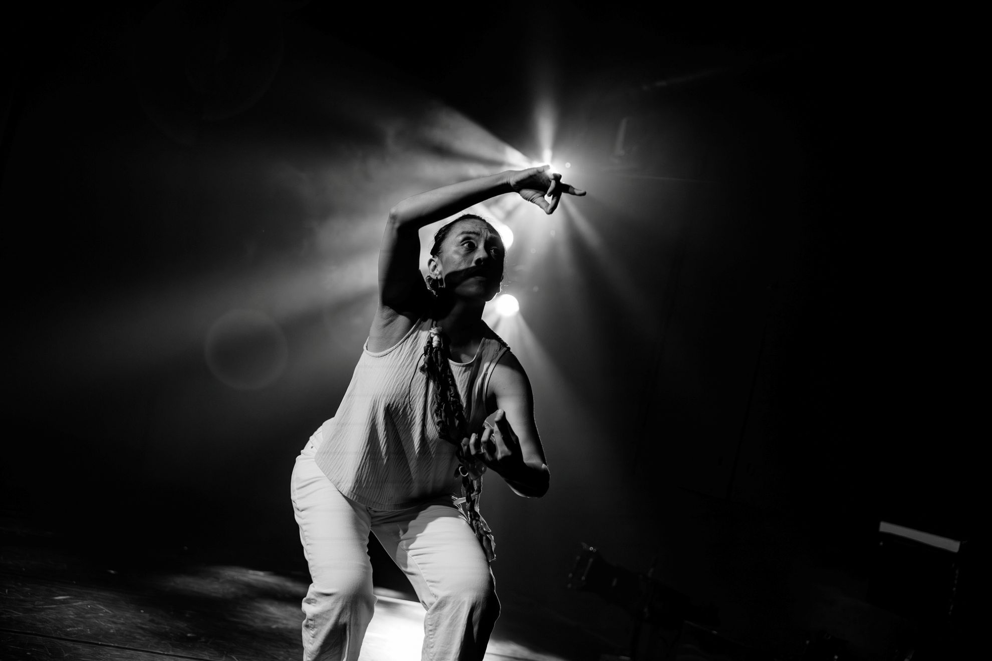 不同語言之間的時間感和空間差,被細膩地縫合穿搭,這是編導的翻譯。另一個隱藏的翻譯者,是XRLab@NTUT團隊製作的VR,同步將表演者的手語翻譯成影像,讓聲音以另一種方式「被看見」。但即使褪去光的迷幻效果,讓兩名表演者的聲音與身體,清楚、乾淨地呈顯於眼前,亦毫不遜色。