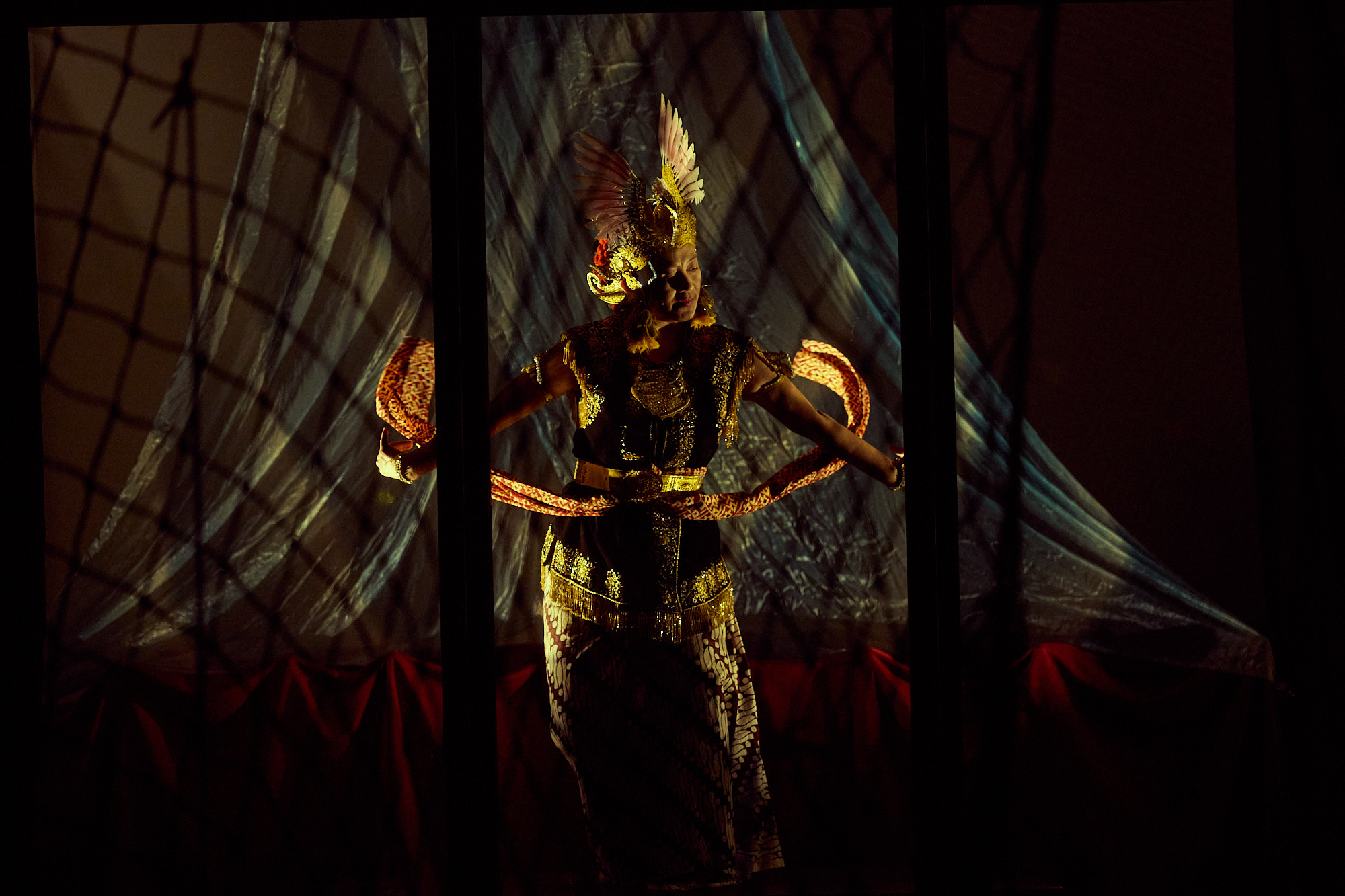 當網後舞台區亮起,印尼舞者Anastasia Melati Listyorini身姿如女神,在加麥蘭音樂下款款起舞,踩著古典舞步,擺弄腰巾(sampur),緩曼婉靜,自在安然【6】;來自Temy原鄉的文化符號,代替他發出聲音,然那不是申訴、抗議、哀嘆之聲,而是一個遙遠而古老的夢境,從意識深處浮顯,叫異國人認識了她的美。這裡沒有文明與野蠻的對峙,只有文化歷史的異源並置。
