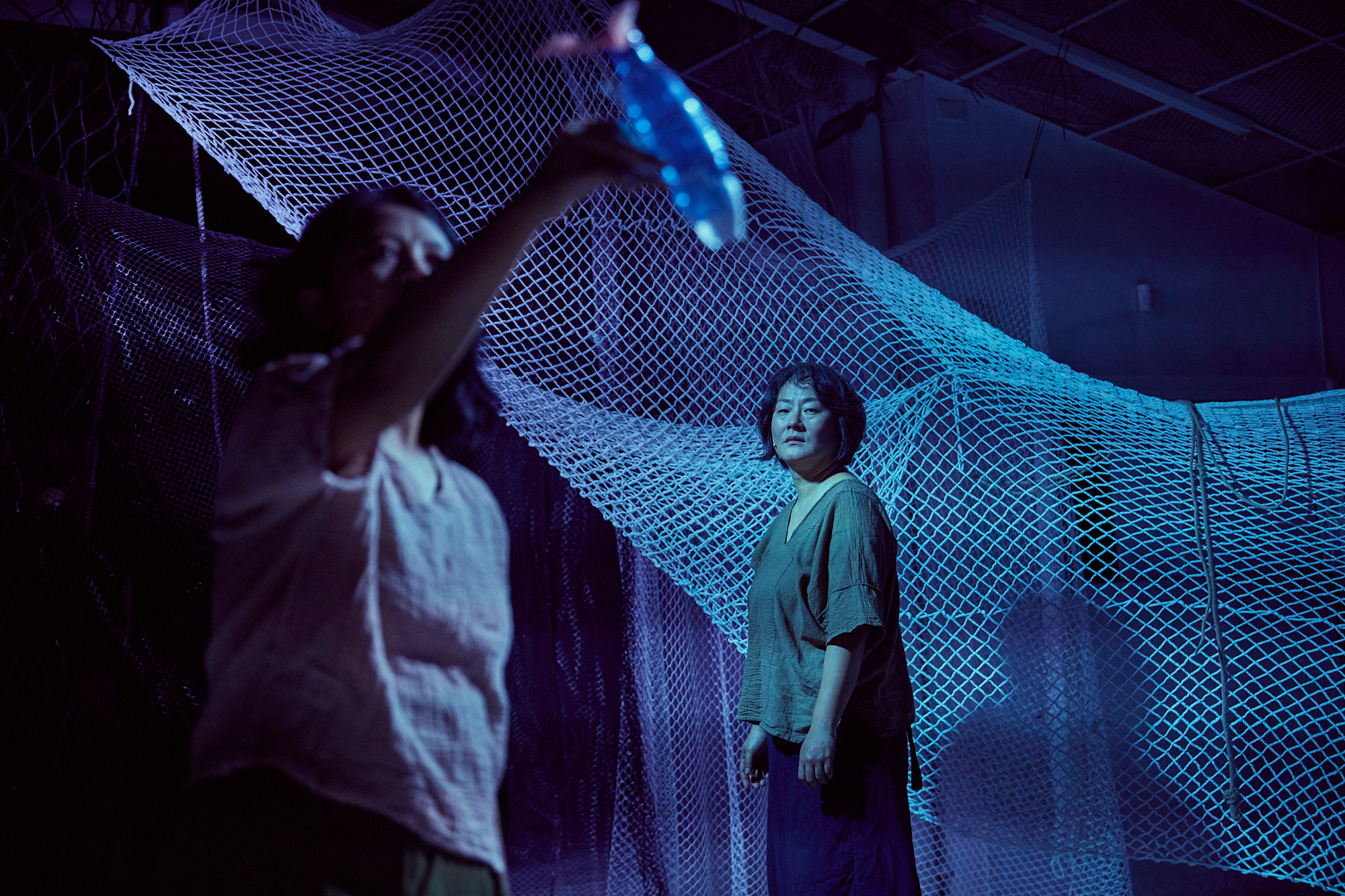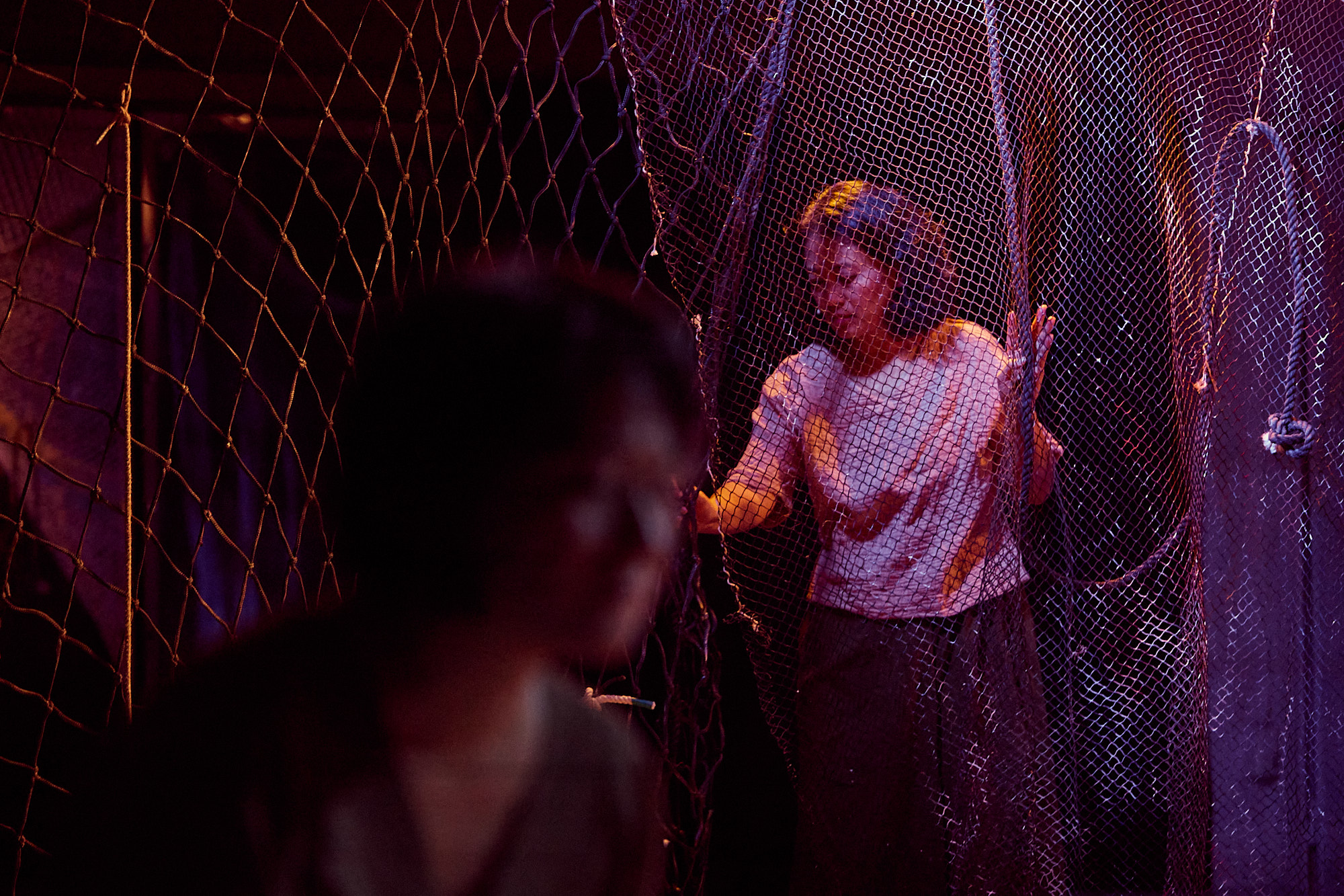 南村劇場的空間類似米倉,皆為活化老舊建築蛻變為表演藝術文化實驗基地的非典型劇場。首先穿過賣場、觀眾席,狹長空間走到底才是表演區,後方原本的舞台儲物區也被打開來,顯出材質與高度不同的前後兩塊地板,由一面懸掛半空的繩網若隱若現分隔。燈光微黃,與低頻律動堆疊海流與機艙環境的微音,構成無形的敘事空間;粗長繩索、拆解的四塊(南管樂器)則是有形的敘事物質。說書人(王珂瑤)有明亮又有厚度的聲線,以標準華語描述印尼漁工Temy的身世處境——沉重的工作壓力,不合理待遇,他倍加思念家鄉,但日復一日工作,他逐漸意識到上岸永無天日,終將葬身大海,與生前捕撈的魚貨共同漂流。但此刻至少,他的名字被聽見了,但以一種外國語言敷上註解: