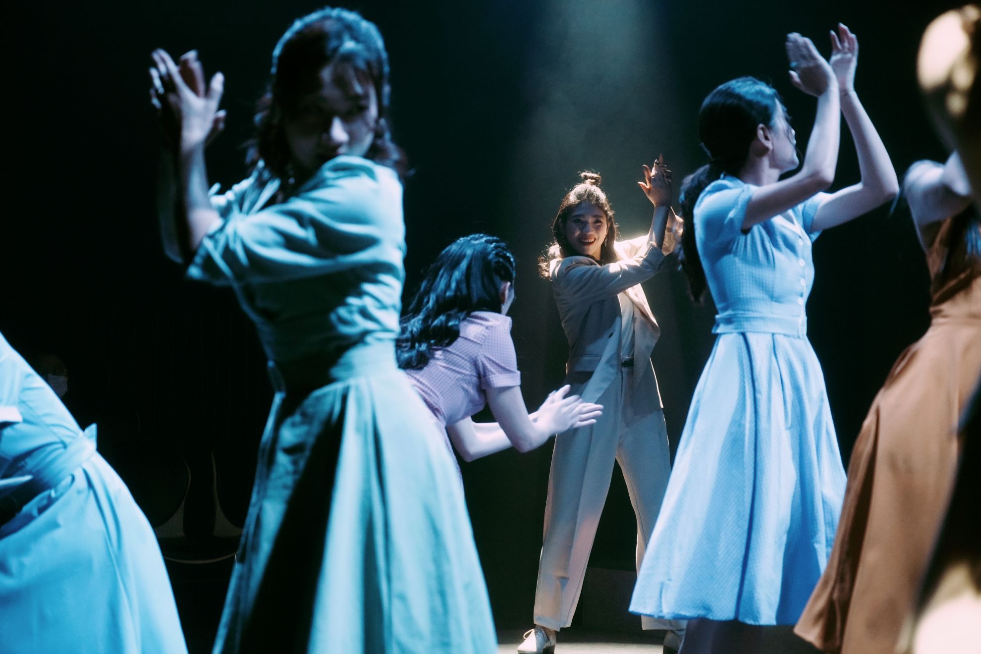 開場,一位舞者赤著腳,以少女的姿態表演「成為美」的過程。動作純真、輕柔,以芭蕾舞蹈的肢體表現。隨後,幾套衣服從空中緩緩降落——像是命運的提示,也像是社會為女性預先準備好的多重框架。少女在衣物之間穿梭,彷彿面對「成為何種女性」的選擇。洋裝在此不只是服裝,而是一個文化符號——象徵社會對女性形象的既定期待,也為後續高跟鞋的出現鋪陳了意義上的轉折。