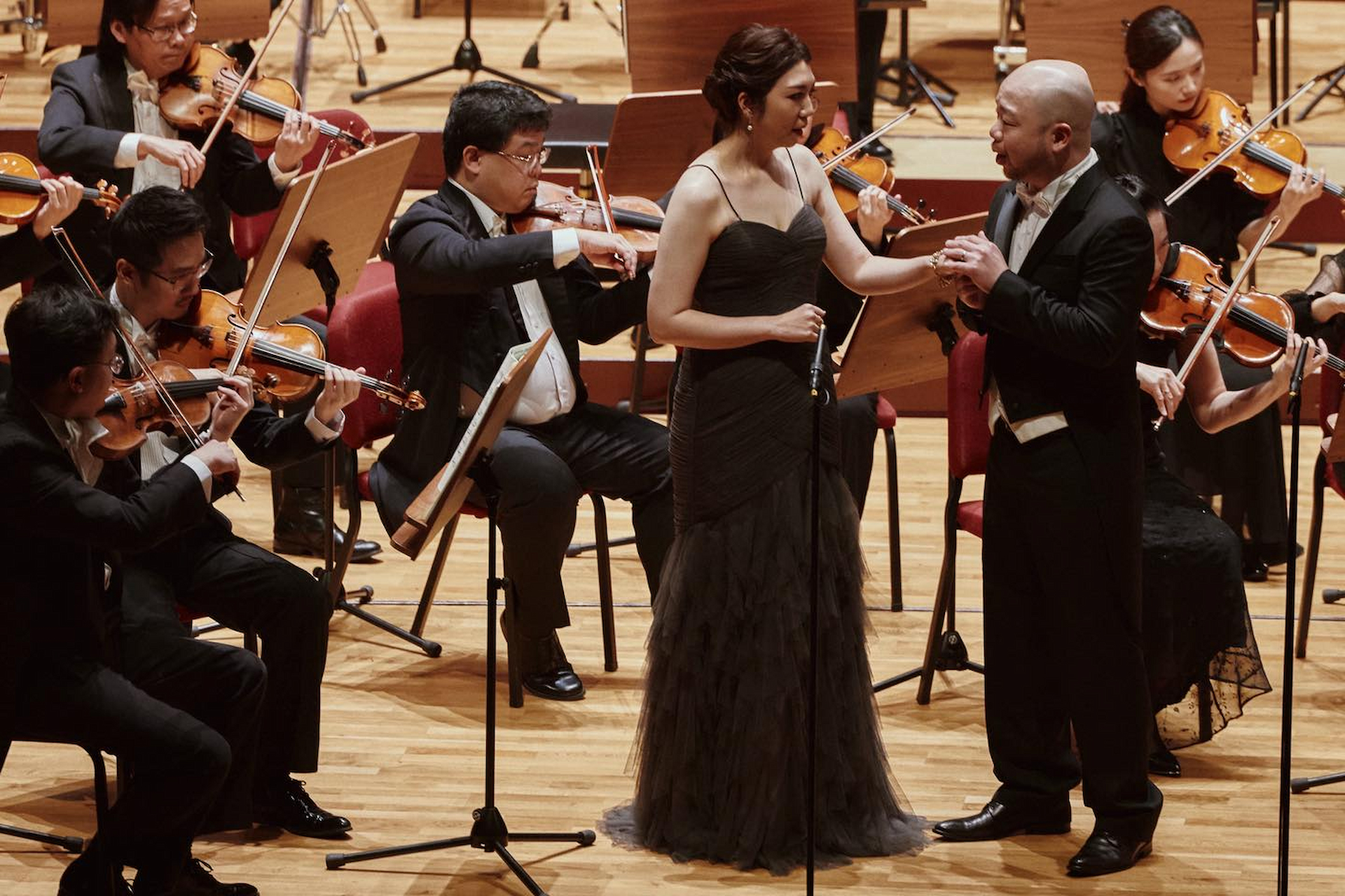 上半場最後一組曲目,是台灣歌劇樂迷熟到不能再熟悉的普契尼(G. Puccini, 1858~1924)歌劇《波西米亞人》(La Bohème, 1896)中第一幕的終曲段落:男主角魯道夫(Rodolfo)與女主角咪咪(Mimi)的愛情二重唱。這組台灣樂迷聽到熟透但依舊愛不釋手的經典曲目,由台灣女高音蕭涵與黃亞中攜手唱來,像是啜了一口餘韻悠長、充滿細膩香氣的香檳,令人感到耳目一新。尤其是黃亞中的演唱細緻優雅,與女高音蕭涵聲音之間的搭配平衡,不強烈卻是充滿音樂的層次感,讓觀眾的聽覺被歌聲溫柔地包覆。