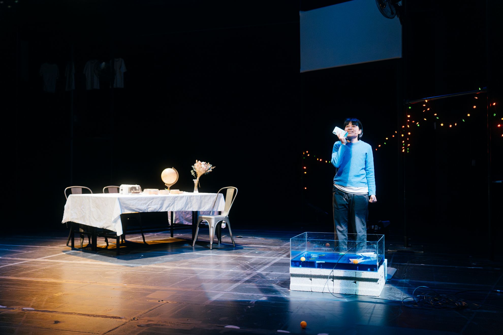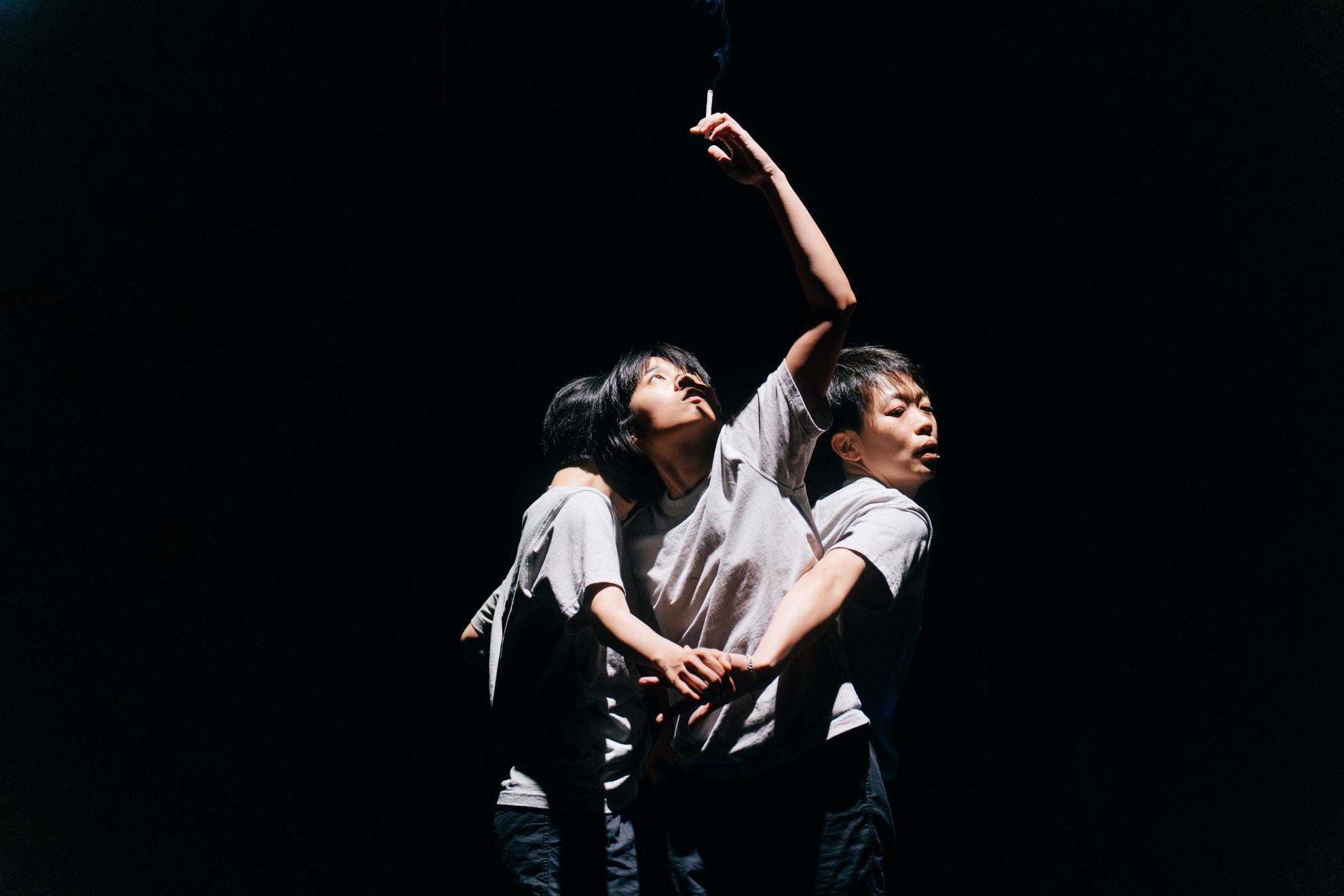 因此,作品的策略大致可分為「聲音」與「肢體」兩條路徑:聲音部分以粵語播送海外流亡者與在囚者的書信內容;舞台上則由四位舞者以身體勾勒另一層敘事。在簡約的空間配置下(左下舞台置一水缸、上舞台兩側長桌、上方懸掛風扇),聲音、肢體與場上的水缸符號時而相互合作進行敘事,時而透過對照展現流亡者與在囚者關係的矛盾與斷裂。