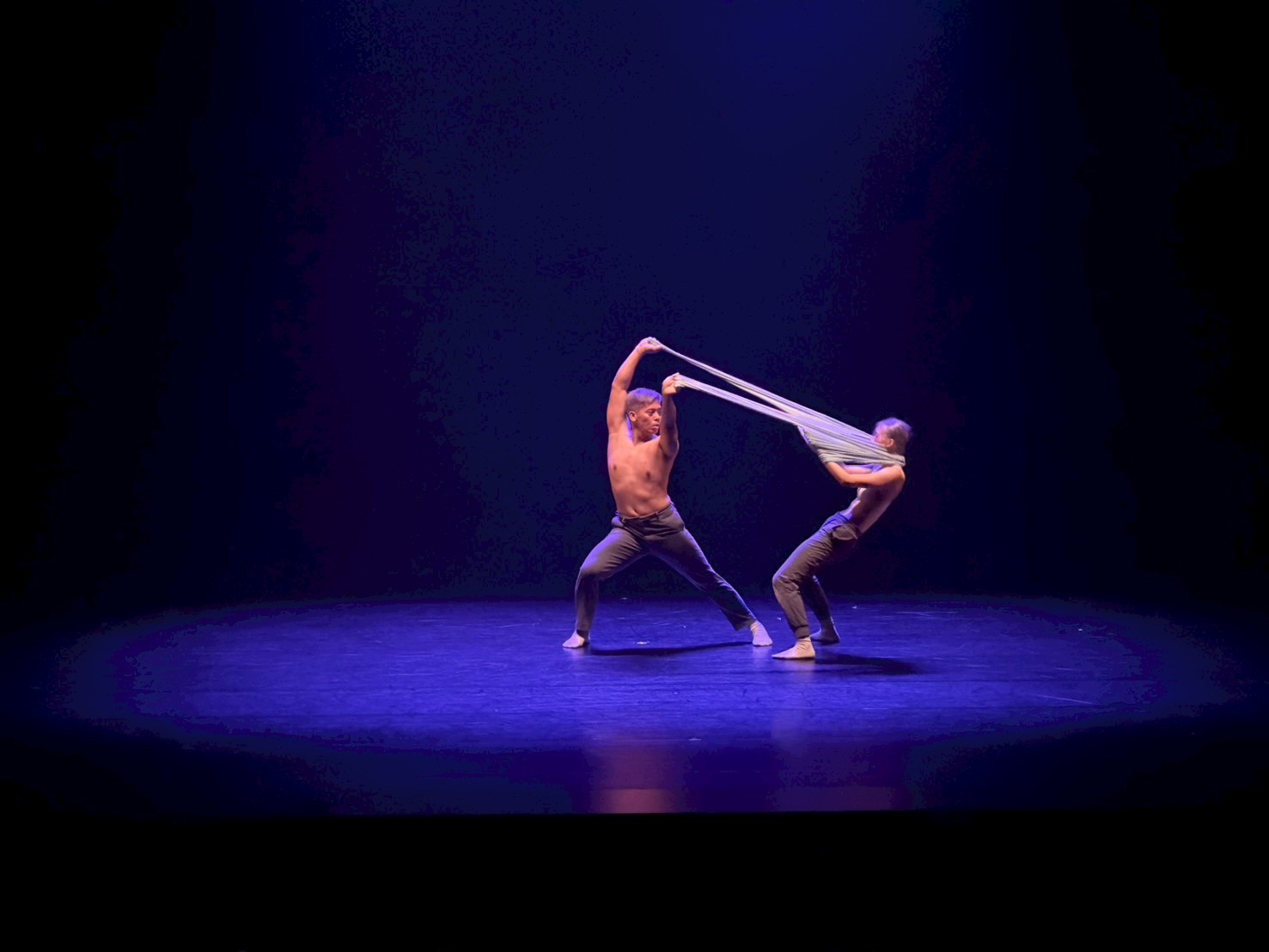 卡比都萬.卡拉雲漾的動作,走的是完全相反的方向。他俯身,用嘴叼起女舞者落在地上的衣服,雙手完全退場,只剩牙齒與布料之間的咬合。這個去手化的動作帶有一種動物性的專注,像某種需要小心傳遞的活物。從地面到口腔,再從口腔到另一個身體,布料沿途沾染了體溫與接觸的痕跡,悄悄從「遮蔽物」變成了「擴張媒介」。舞者扭曲它、擺弄它、把它撐開,衣物在此既是邊界,也是橋梁,讓兩個身體透過同一塊布料,重新摸索彼此的空間餘裕。