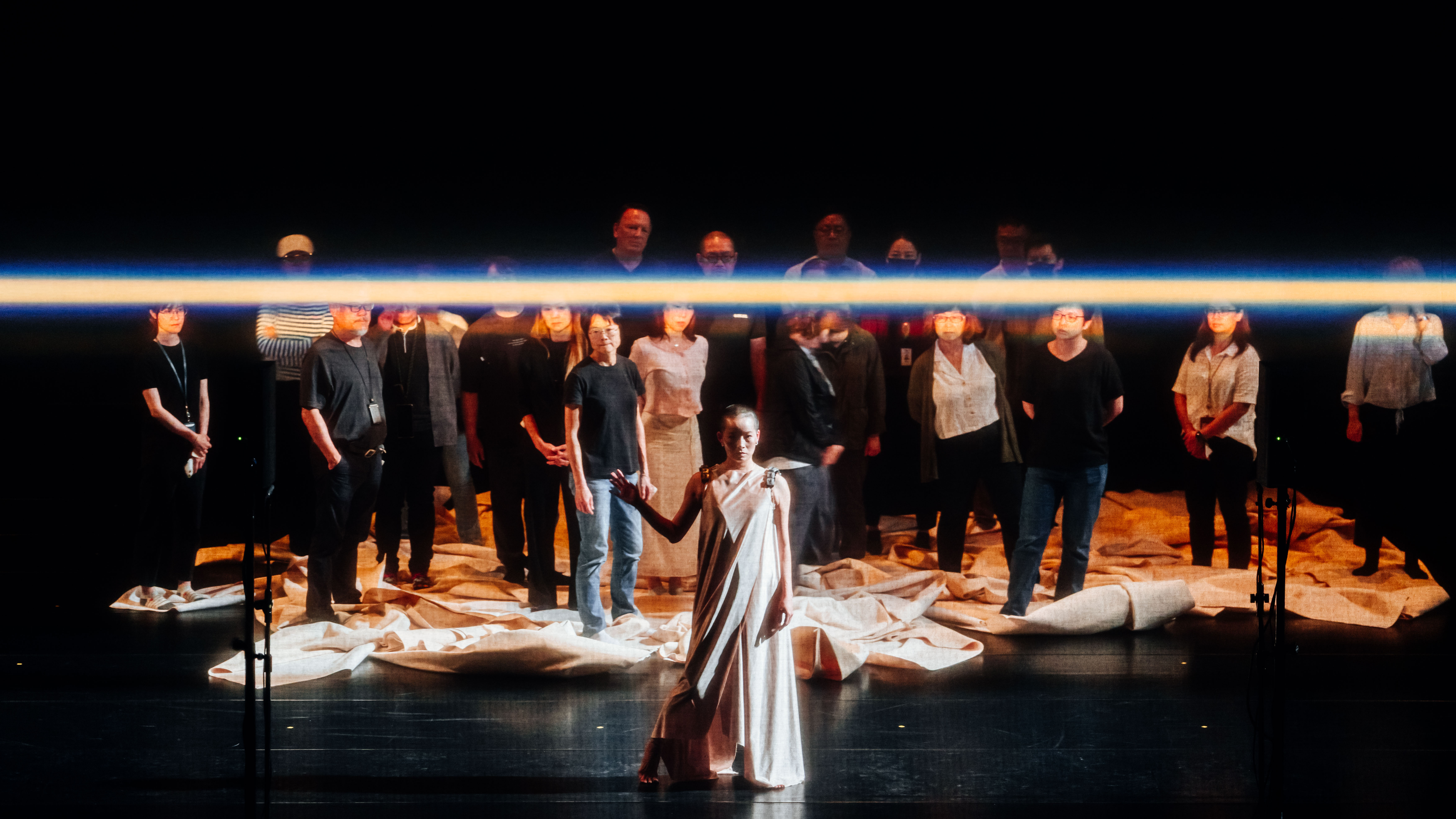 接著舞者把白布逐步拉縮集中,人群於被迫折疊縮小的白布上匯集,一番如生存遊戲搶佔遞減空間的行動後,眾人密集擠站在如隆起海面的島嶼中。這過程間,人聲消失,器樂等等聲響如音高鑼聲、鋼琴塊狀聲、大鑼滾奏漸強聲,轉為聲響主軸;在突然一聲大鼓巨響後,眾人正前方的舞者動起,跟著來自現場樂團的狂飆樂音起舞,此段實為精彩,劉奕伶的肢體敏捷地展現與音樂質地對應緊密的各種對比,在複雜聲響中抓得住樂感中的重要語彙,不論當下音樂跳出重點是音高或是節奏律動、亦或織度色彩的明確變化,此段獨舞相當高明,動作與音樂的連結是相當有感的,也與她前面段落如執行公務般的刻意木然,角色有了對比性的鮮明定位;同時臺灣笙演奏家李俐錦的演繹在此段相當突出,聲線的放送顯著。此刻眾人們望眼穿過黑紗幕,直視樂團、也發現了另一邊的觀眾席,頓時明瞭,我們是被觀看著。