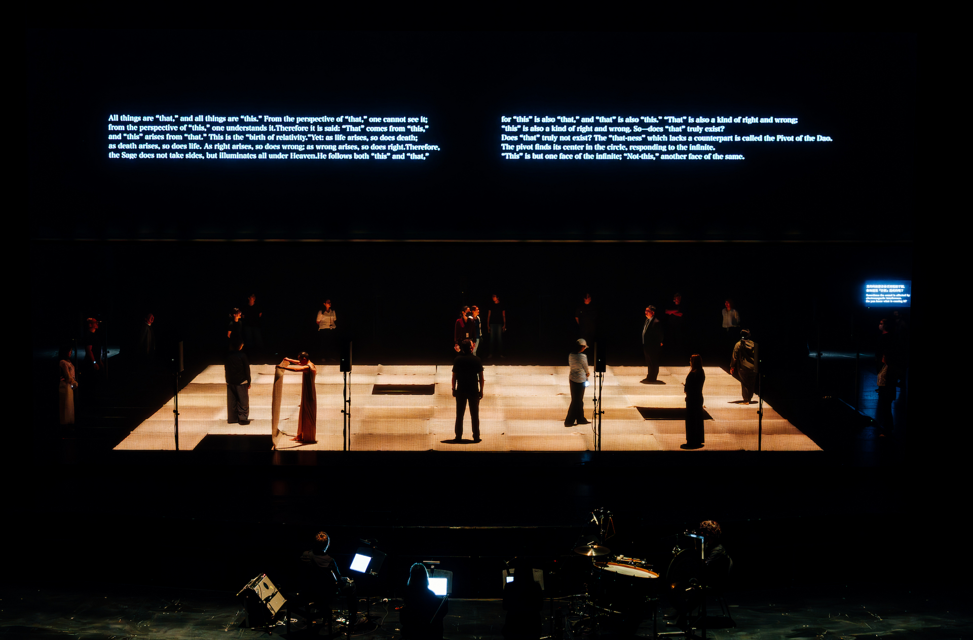 此處與獨舞共同演繹大約三分多鐘的音樂,展現張玹相當集中也出色的創作能量,在樂團聲響集體遞進的急促感、上升音量、音高與強音節奏反覆同時推進至高潮之處,終由一記大鑼滾奏漸強結束,音樂剩下宇宙失重感的懸粒飄浮高頻聲響,佐以些許規律低頻隨機隱現,場上眾人離開至台下觀眾席,坐定觀看下一組觀眾的故事。等待間,比利時強音樂團擊樂手Tom De Cock給了我們一段詩意十足的大鼓獨奏,低沈、殘響綿長的單擊、稍短悶的雙棒貼鼓面疊擊,兩聲緊密的裝飾音,錯落在空間裡,黑紗幕另一邊的下組眾人現身,鼓聲漸弱消失。