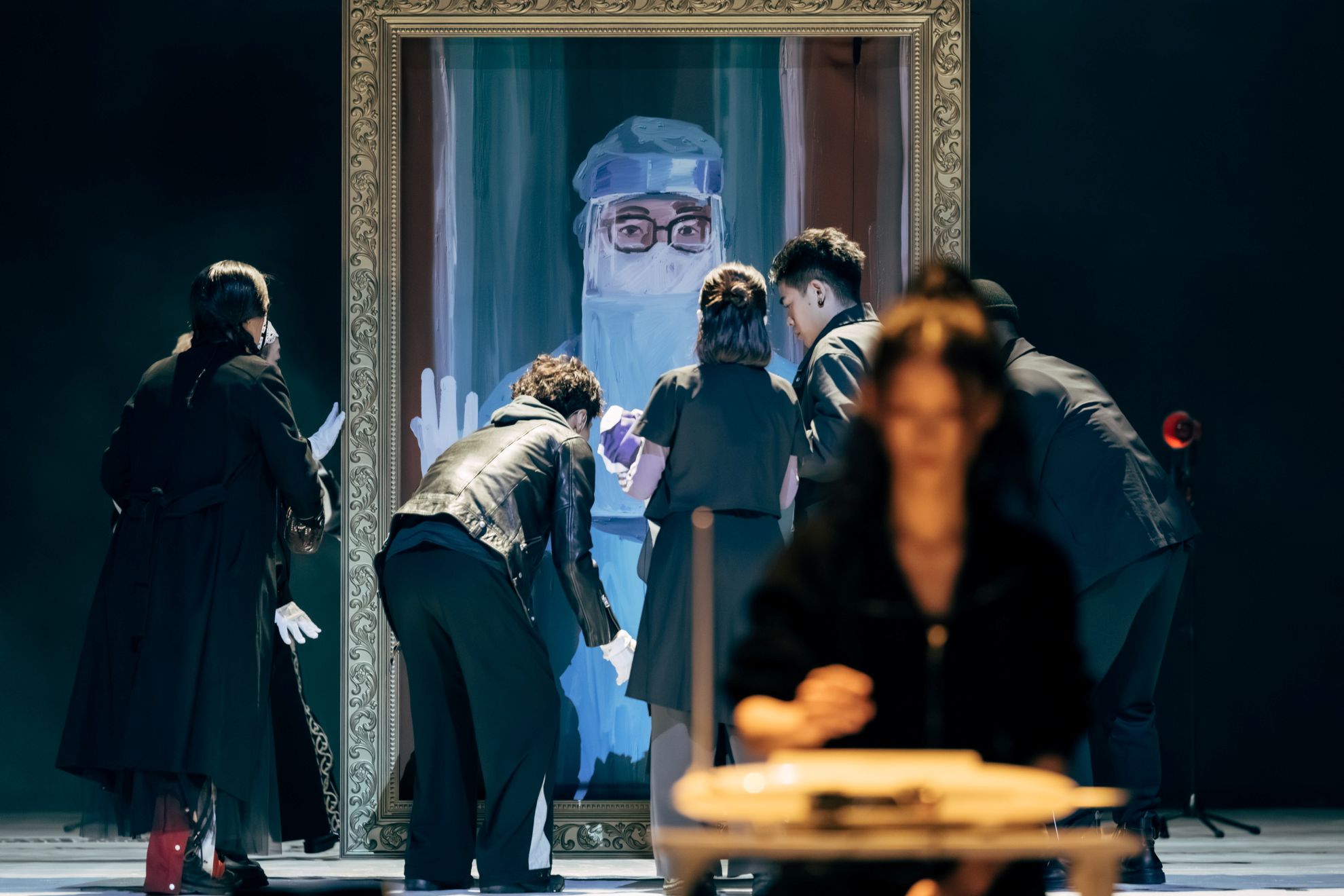 社會事件複線於是無意為兩岸政治主軸提供補充理解,似乎更傾向透過社會事件下的小人物拆解傳統的英雄框架。如導演在節目冊中所問:「歷史不斷創造英雄,但英雄也不斷殞落。面對社會動盪,我們真的需要英雄嗎?又或者,社會真正需要的,是每一位前往花蓮堰塞湖救災的人。【1】」作品藉由演員集體抬出畫框,透過投影的方式,將英雄形象從古埃及法老、黨國歷史中的蔣中正,轉向太陽花學運佔領立院時的孫中山像,最後延伸至北捷事件後的平民英雄與疫情一線醫護,能感受到其挑戰黨國英雄史觀、轉向肯定小人物價值的企圖。