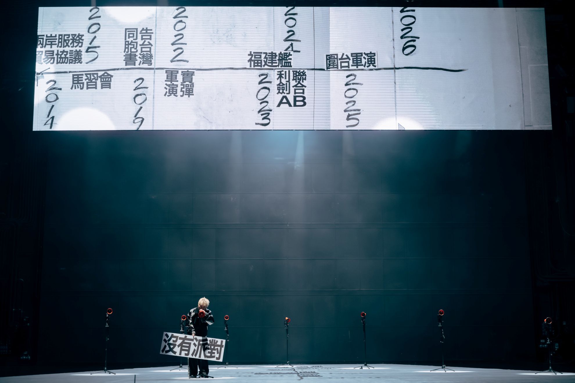 這種指向力的矛盾本該為作品提供更深層的辯證空間,使觀者停滯於特定的歷史節點進行凝望與反思,作品卻僅止於讓演員透過各節點上的大聲公進行不同政治發言的諧擬,固然以此喚起集體記憶並傳達對政治不耐的精神狀態,歷史卻也只是藉此被輕易帶過並快速推向2026年;不僅是單點歷史無法被縱向深挖,一旁補充的大量社會事件複線,亦未能橫向拓展為協助理解兩岸政治主軸的比較網絡,僅如同政治大事記般被一一列席點名。最終,書寫在編年史軸線上的大事件,無論兩岸政治主線或社會事件複線,皆呈現為彼此孤立的散點,未能交織成具備多端點的關係性思考網絡。