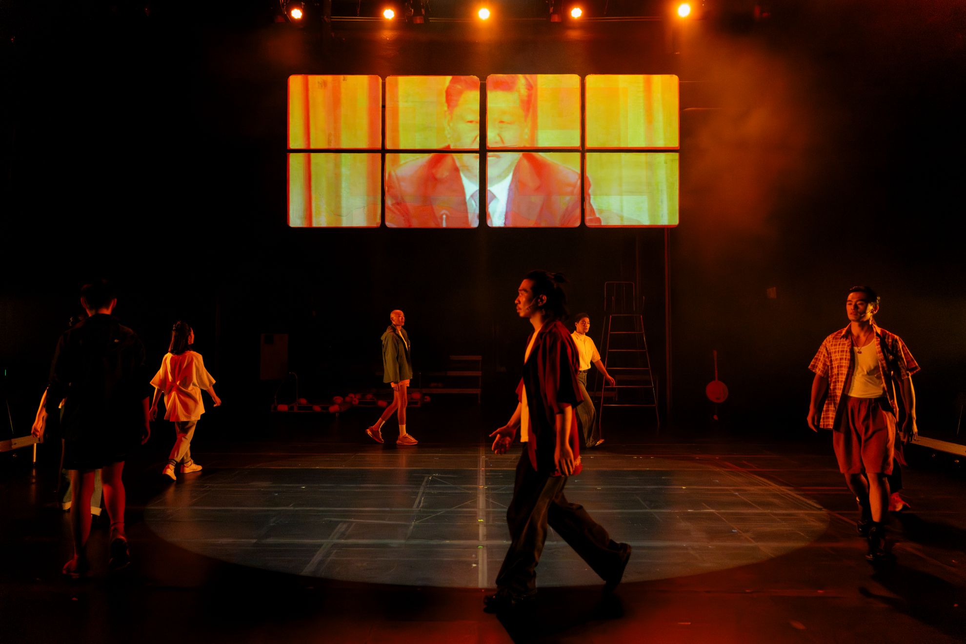 《這不是個大使館》曾有多篇評論指出的「代言」(representation)問題,【3】因而成為《2064:奧運預演》得以著力且進一步玩味之處。所謂的「我們」共同體,先由台上來自不同家庭背景的表演者一一敘述自身「認同意識」之萌芽、發展、思辨與抗爭,並將眾人集結移動式台座,營造「同島一命」之集體意象。接著,由Ihot Sinlay Cihek/卓家安邀請觀眾提供圖像素材,供AI集結生成一面「國旗」,擴大「共同體」以涵蓋全體觀眾。