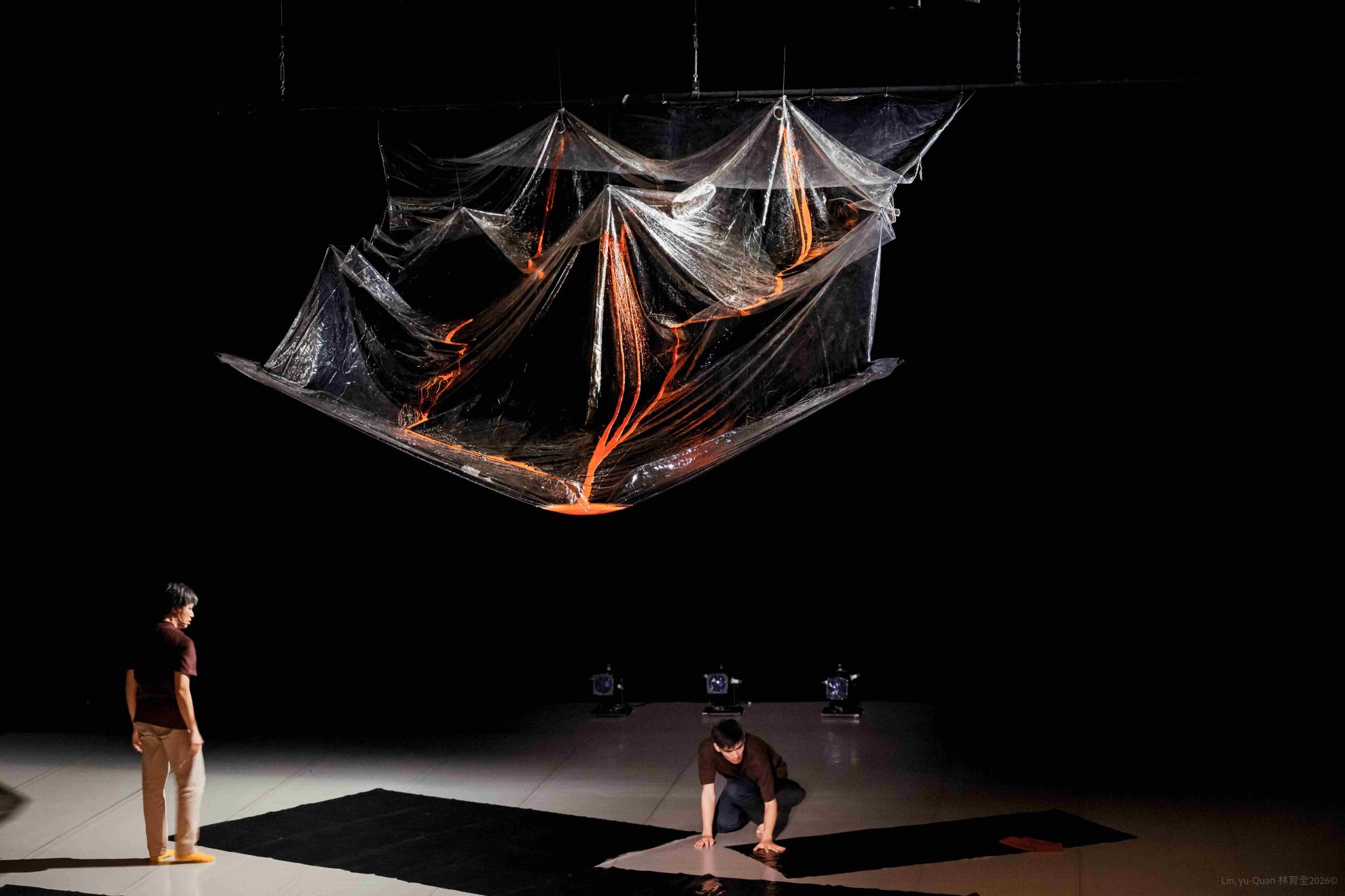 舞台上方懸吊著層層透明塑膠袋,構築出由高至低、帶有山巒意象的空間裝置。在光影的映照之下,觀眾得以觀看其不同面向。其下,周以沉緩的節奏展開動作:自肩胛骨兩側延展雙臂,繼而由指尖觸及肩膀,向內擠壓至脊椎,彷彿在反覆喚醒身體的內部結構。與此同時,上方的塑膠裝置開始承接自天花板滴落的水滴。隨後,在音樂重音的驅動下,周的身體逐漸帶入下墜的重力感,並加速重複先前的動作。緊接著,原有音樂被打斷,插入習近平於《告台灣同胞書》發表四十週年紀念會上的講話錄音。原長達三十二分鐘的發言,在此僅被擷取涉及「同根同源、同文同種」、「台獨是歷史逆流,是絕路」等段落,並包含會議中「無人反對」的表決過程。透過此一聲音素材的置入,演出進一步形塑出台灣與中國之間對立的他者關係,並延續先前周於大陸旅行經驗中所開啟的曖昧感知。面對這段政治語言,兩位舞者以高度符號化的「舉手」動作回應:此一動作既可被理解為在壓迫情境中爭取發聲的姿態,同時亦指涉民主體制中表決與表態的權利。