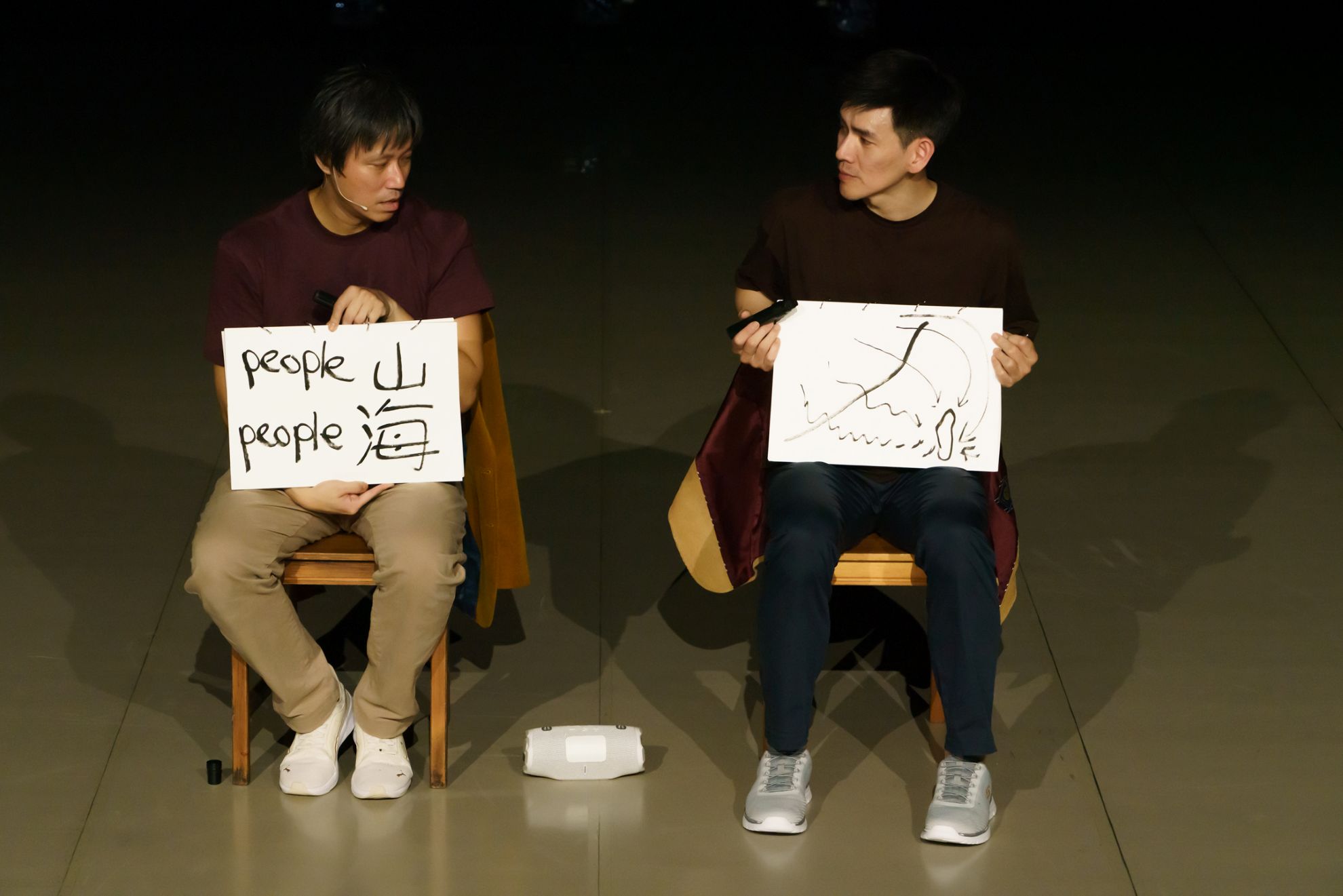 演出伊始,周自左舞台持一本空白畫冊登場,隨即寫下「這場演出我不會在台上說話」,翻頁後續寫「因為很難」。書寫之間,他短暫停頓,抬頭望向觀眾。進入下一段落,在節奏分明且強烈的音樂驅動下,周與李自上舞台展開動作,透過簡單的左右重心轉換形成交會關係。其中一方不時停滯,以打破原有的擺動方向,另一方則偶有凝視對方的瞬間。當兩人越過舞台中央後,動作語彙逐漸集中於「舉手」:有時止於半途,彷彿欲言又止;有時緩慢抬起,幾近無聲;亦有時精準伸直,並將重心穩定於單腳之上。當位置逐步逼近下舞台時,李以點頭示意,開啟下一段落。
