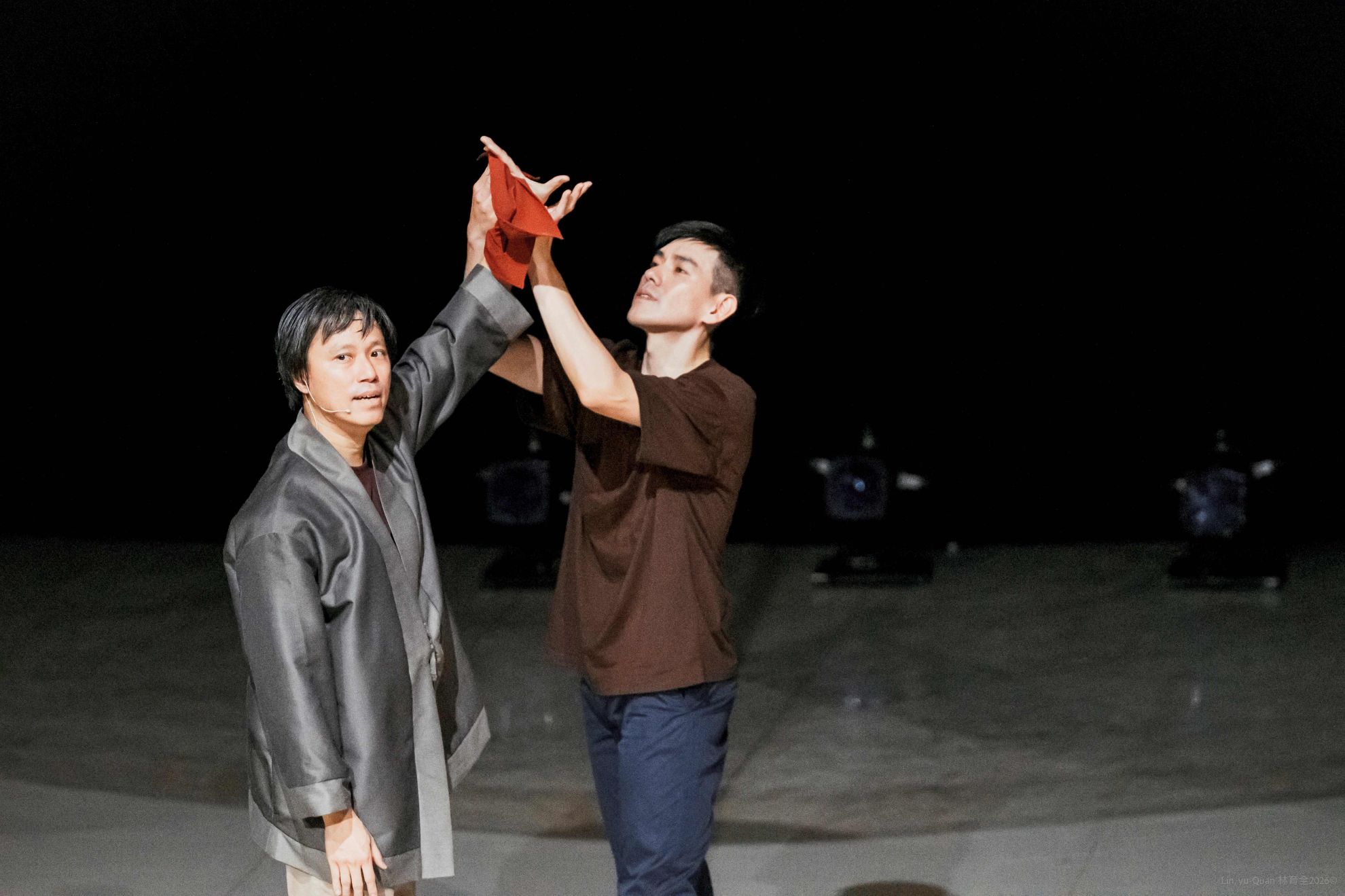 在彼此傾聽與觀看對方的敘述之後,兩人於舞台中央相擁。這一擁抱既帶有相互牽制的張力,又隱含試圖共同移動的可能。當兩人分離之後,其身體語彙產生明顯轉變:不再拘泥於先前中國舞所建立的身體結構與符碼,而是將原本筆直、勁道鮮明的動作轉化為收縮、曲折的運動路徑;在神態上,也不再強調中國舞所重視的「精氣神」,李甚至以近乎諂媚、輕浮的笑容取而代之。然而,有趣的是,無論周如何轉化其動作語彙,中國舞的運動軌跡仍然清晰可辨。換言之,這套舞蹈語言早已內化於其身體之中,成為無法輕易剝離的身體記憶。於是,其身體所呈現的歷史,反而與其口中所建構的台灣/中國二分產生張力,甚至形成內在衝突。