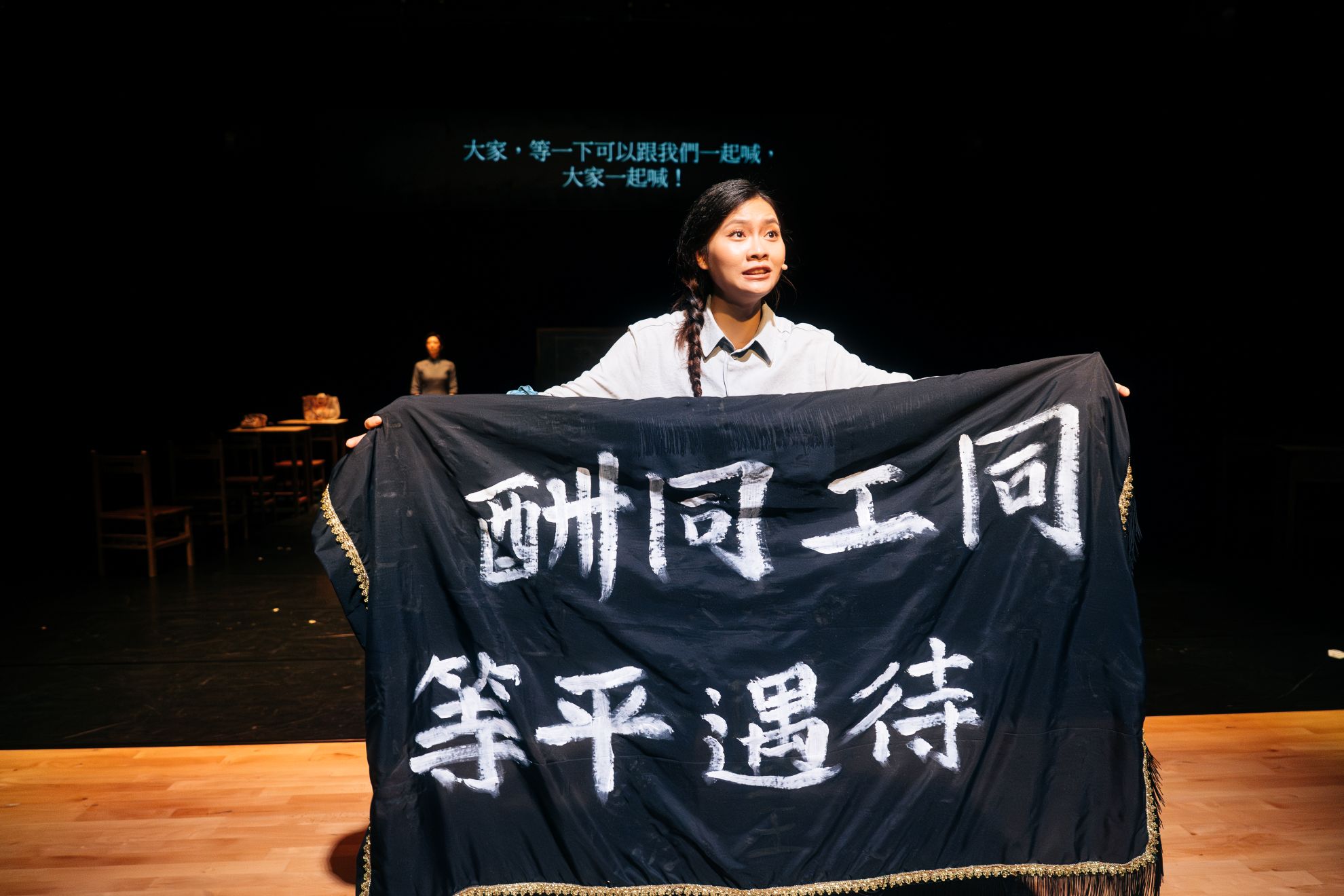 本劇一個將抗爭知識媒介化的設計,是將左翼禁書的傳閱與當代的公共傳播進行對照。當演員進到觀眾席分發「同工同酬」的傳單,呼籲觀眾齊聲喊出訴求並拋灑傳單時,劇場暫時被操演成為模擬抗爭現場。若觀眾只是單純收到傳單,傳單作為知識的載體,維持具備權威性、單向的傳輸關係;但當觀眾拋灑傳單,傳單轉化為集體行動的媒介,其灑落的物質性,象徵理念的流動性與共享性。雖然此類觀眾動員的互動設計會有「以邀請之名強制納入觀眾」的嫌疑,不過當工會運動與階級抗爭的聲音幾乎成為瀕危的政治語言,動員觀眾或許能為這些消失的聲音提供集體想像的演練空間。無法否認的,劇場是一個安全、可控的環境,但它讓觀眾暫時遠離街頭那個政治行動與立場劃分高度綁定的場域,回歸到個人的體感與審美經驗,重新校準自己與共享的信念、與對抗、以及與「團結」這件事的連結。