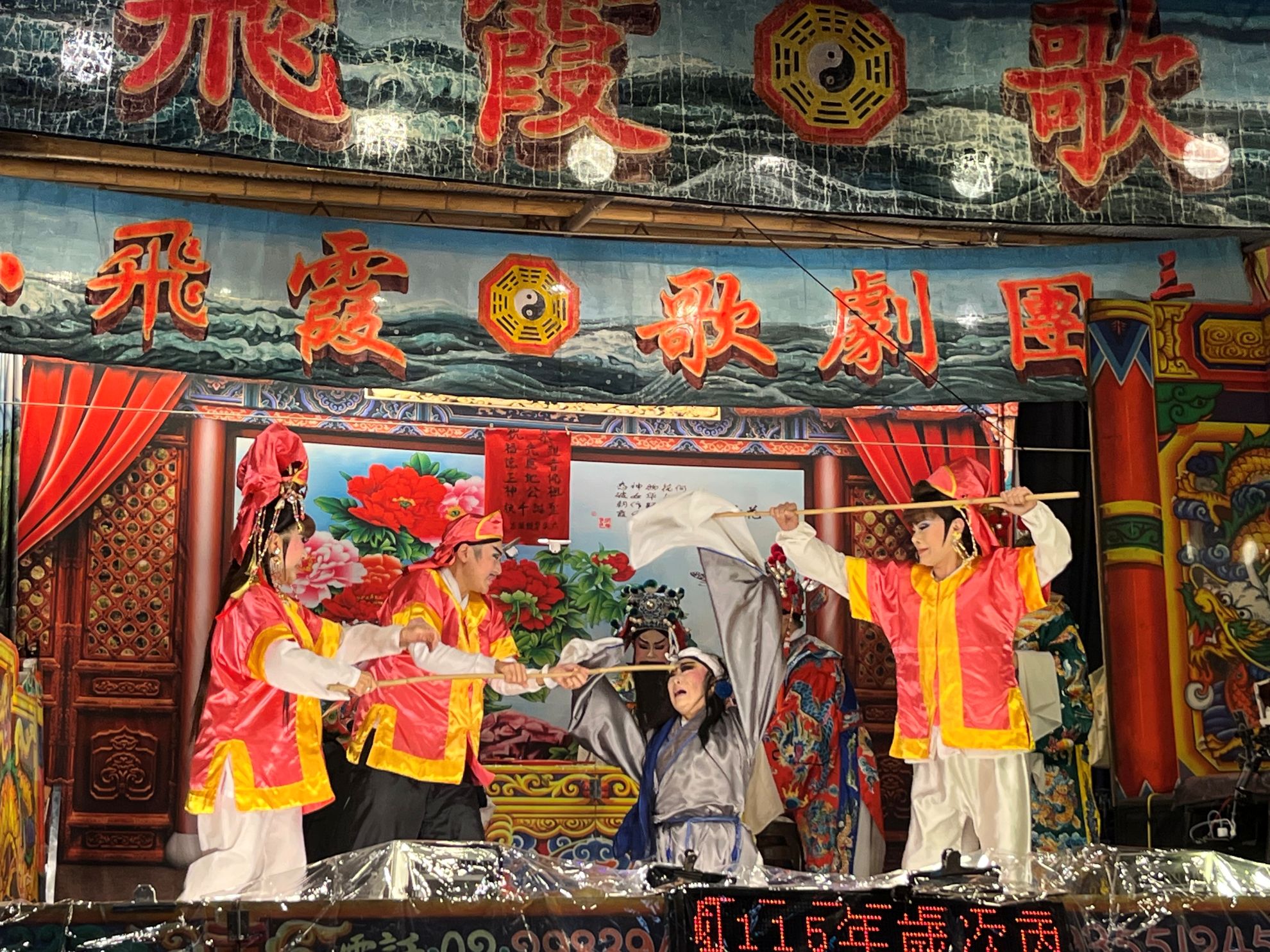 外台歌仔戲在日戲的劇碼,常見取自通俗歷史演義的古冊戲;人物關係清楚,演出篇幅可長可短,較能彈性對應不同的演期需求。小飛霞歌劇團應安順宮三日演期選演《孫龐演義》,從中擷取〈三請孫臏〉、〈火燒悲天院〉與〈三搜朱府〉三折,連本鋪排演出之外,藉著關鍵場面的經營,充分展開孫臏、龐涓由同門師兄弟走向反目成仇的歷程。