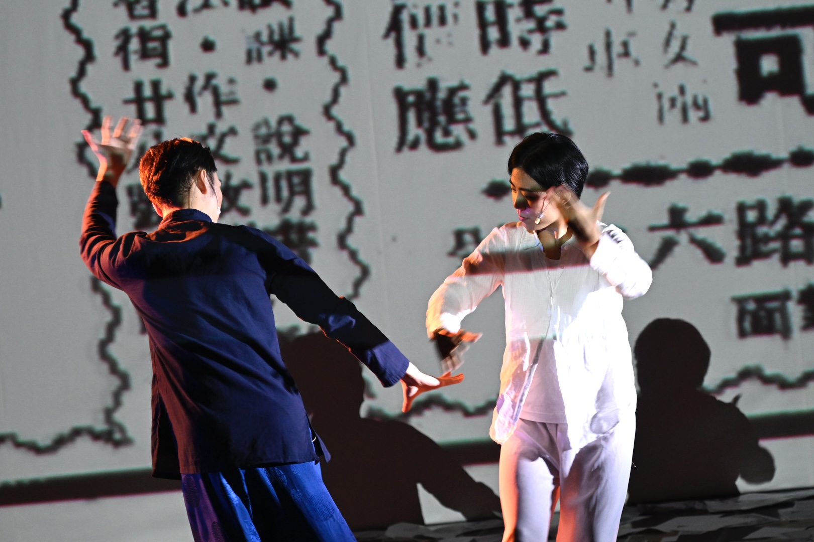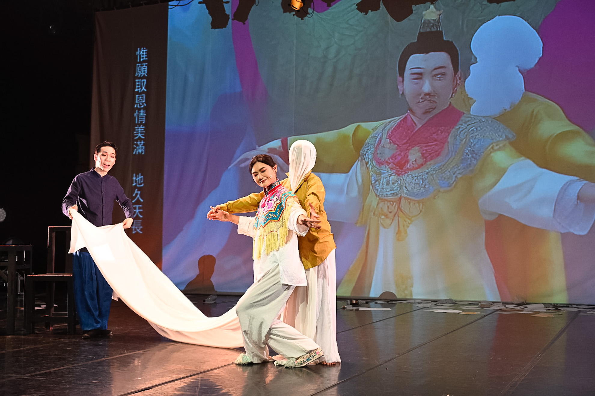 隨後,劇演進入《貴妃醉酒》的段落,李佳泓早已退下說書人的角色,在場邊執行手機的即時攝錄,將AI生成的畫面投影到舞台背景上;這裏,三人玩弄的白布幔成了要角,這件京劇的「行頭」(服裝),行使喜怒哀樂等感情的「水袖功」,也不缺用來表現此劇著名的臥魚、啣杯等身段;有時,就是楊貴妃的水袖披肩,有時是彼此狎弄的布條,或據以跳出現代舞蹈的道具,再加上三人的肢體互動與擺姿,讓我們看到AI生成的圖像捕捉能力,給出百花亭建物、手持的牡丹花、飛燕或鴨等吸睛的形象變幻——甚至,白布幔也讓人聯想到楊貴妃日後被迫自縊的物件。然而,幸好有這匹白布幔,其所給出的造型能力不輸給AI強勢生成的影像,並維持住戲曲的肢體語言與物件能量,並帶出某些反思:關於AI生成影像的撐面(support),除了立面背景,還能是什麼?AI生成除了圖像,還能有什麼內容?它跟劇本能組裝出什麼機器,抽出什麼敘事線?