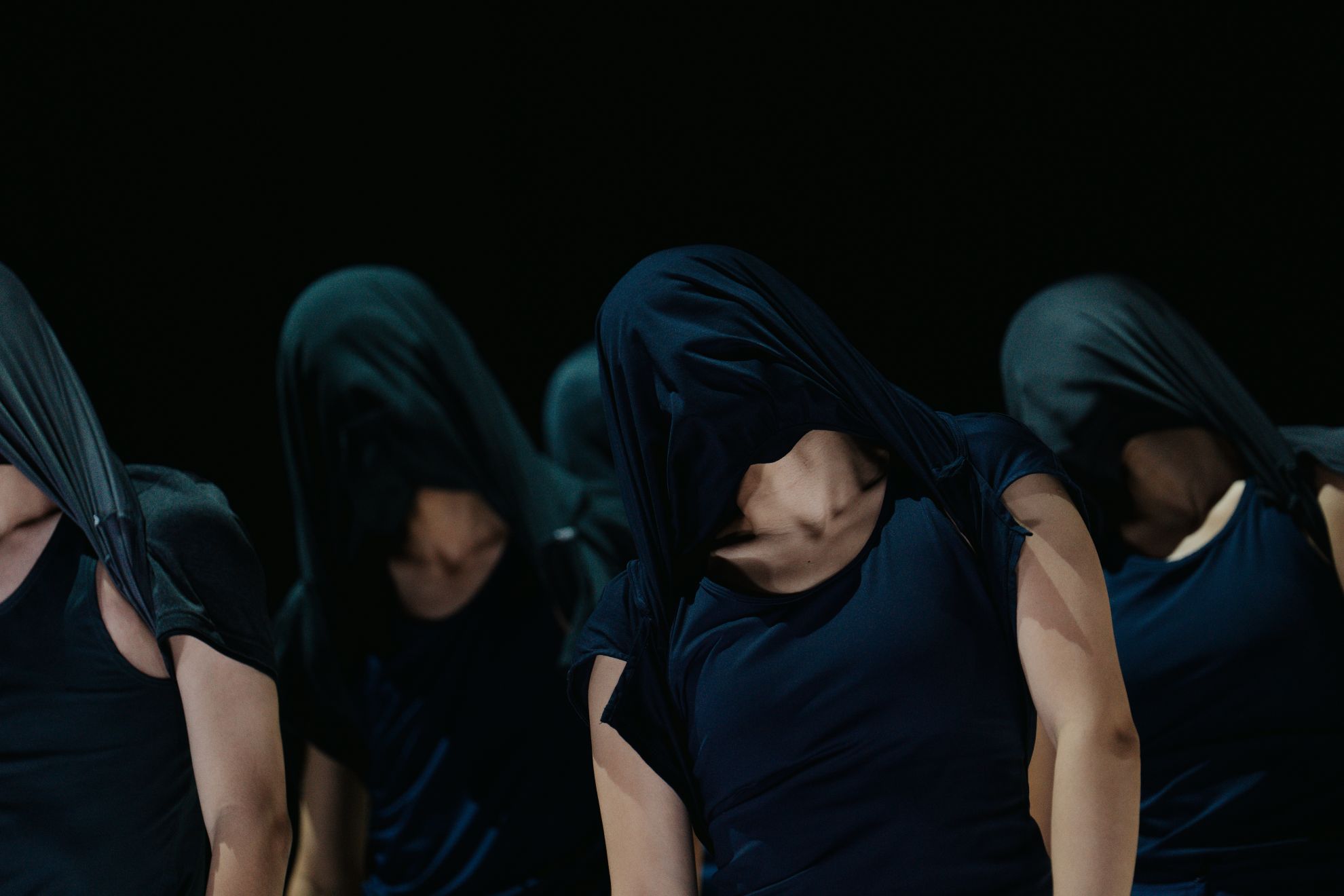 舞台轉向更深的核心。十座長型木箱的排列,瞬間在舞台上構建了失事現場的殘酷畫面。六位舞者立於木箱前,身體僵持在靜止的邊緣,微顫與沾黏腳步洩露了內在的不安。他們渴望逃離,卻被記憶與創傷的重量緊緊壓著。他們反覆進行拉扯衣角、蒙罩於頭上、又掀開的動作,以及伸出手卻又縮回的未竟觸碰,具象化了創傷受害者在自我隔離與試圖掙脫之間掙扎的循環。這些動作,正是編舞者在公共敘事與個人私密邊界上艱難探索的真實呈現。