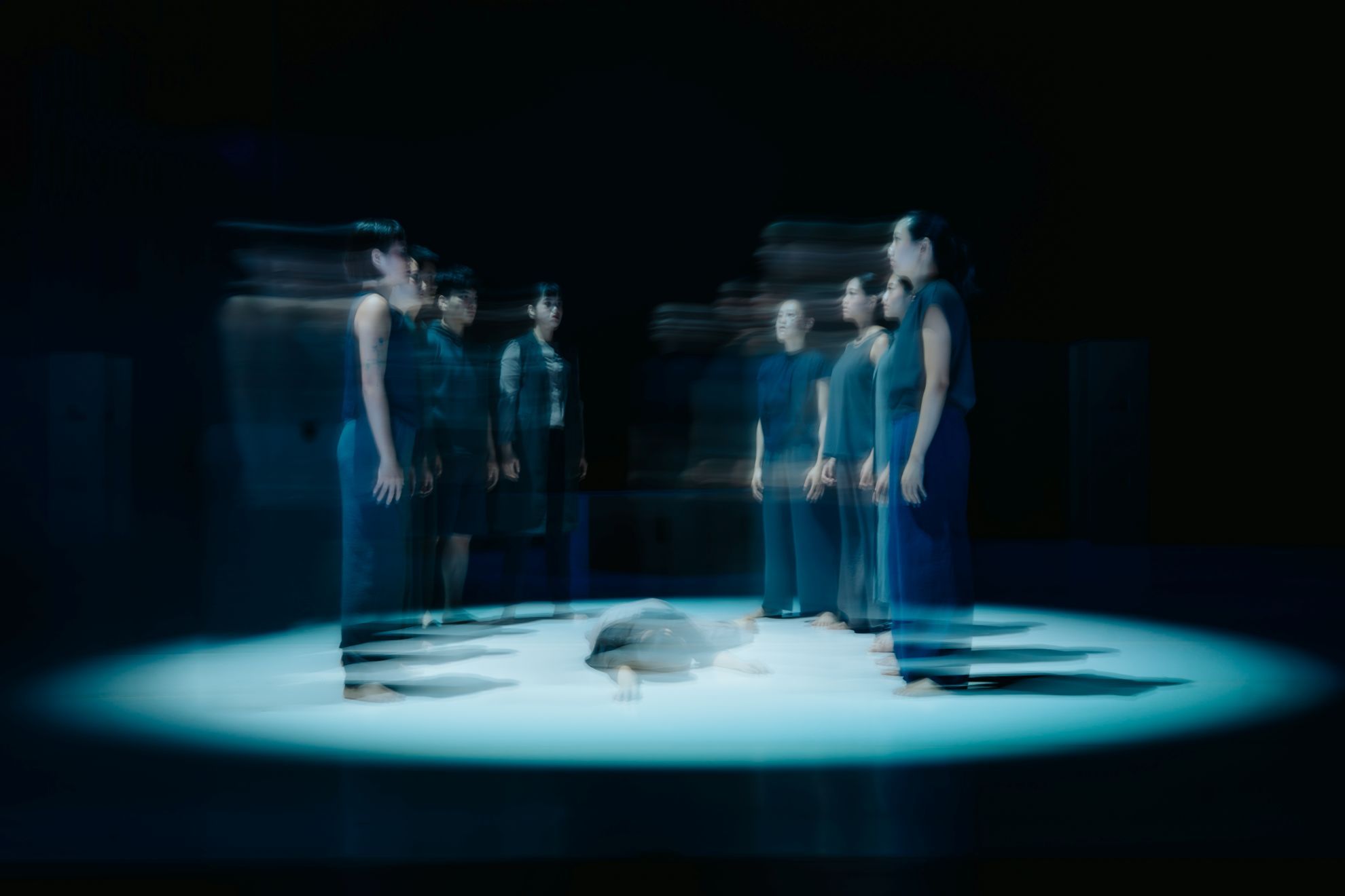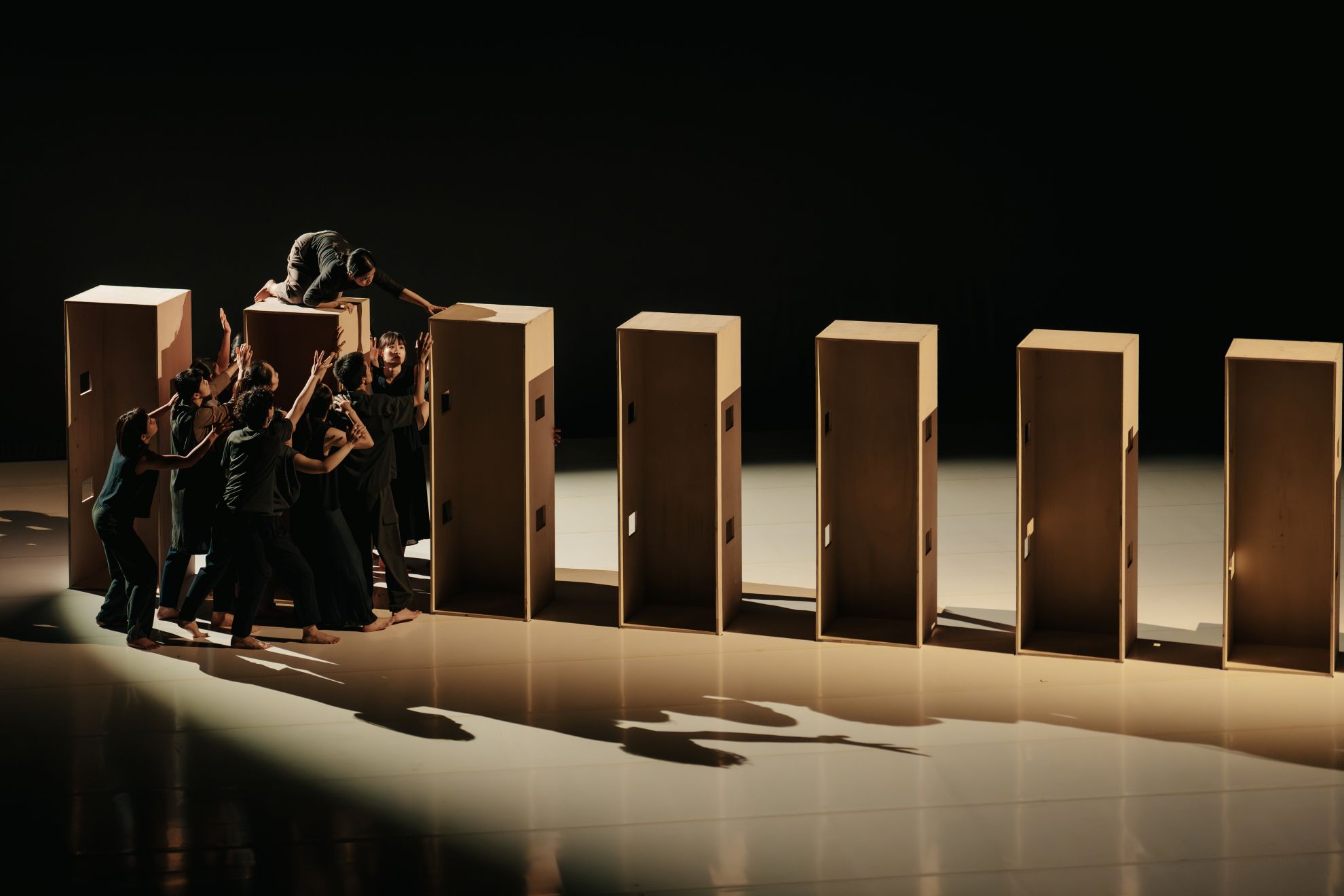 然而,這些冰冷數據與無力肢體的並置,並非為了重現事件本身。「創傷的意義」不再是單一、封閉的事件回放,而是懸置在一個充滿掙扎、尚未被完全定義的「草擬空間」中,等待舞者透過身體的重複與集體的力量,去慢慢重寫和定義救贖的可能。而這重寫的過程,首先體現在時間與空間的重新配置上。舞作隨即呈現強烈的時間與空間意象:舞者在線性隊列中反覆分裂、合一,如同生命在撕裂與修復間掙扎。長型木箱(暗示殘骸與棺木的舞台裝置)一字排開,肅穆而冷冽。此時,光暈如日晷般緩緩朝中心聚攏,將群舞者的身體壓縮為剪影,彷彿被時間的巨輪碾壓成扁平的記憶。他們雙手攤開,無力地晃動。