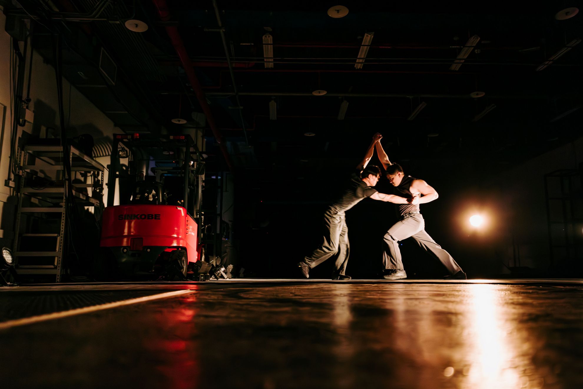姑且不論其中馬戲技術的運用,在這場將勞動與權力綁在一起的演出中,作品大量以二元的雙人關係或群體關係來揭示權力的階序。然而,作品選擇在衛武營西區卸貨碼頭這個具高度「層級化」潛力的特定場域表演,卻迴避劇場空間本身的階級性;在本可利用空間層次顯化權力的地方,觀眾卻只看見天花板的最高水平與地板的最低水平之間的單一對位。如此扁平的權力呈現,不禁令人疑惑:這場跨文化和跨領域的共同創作究竟想在權力與勞動的關係上開啟什麼樣的共識?