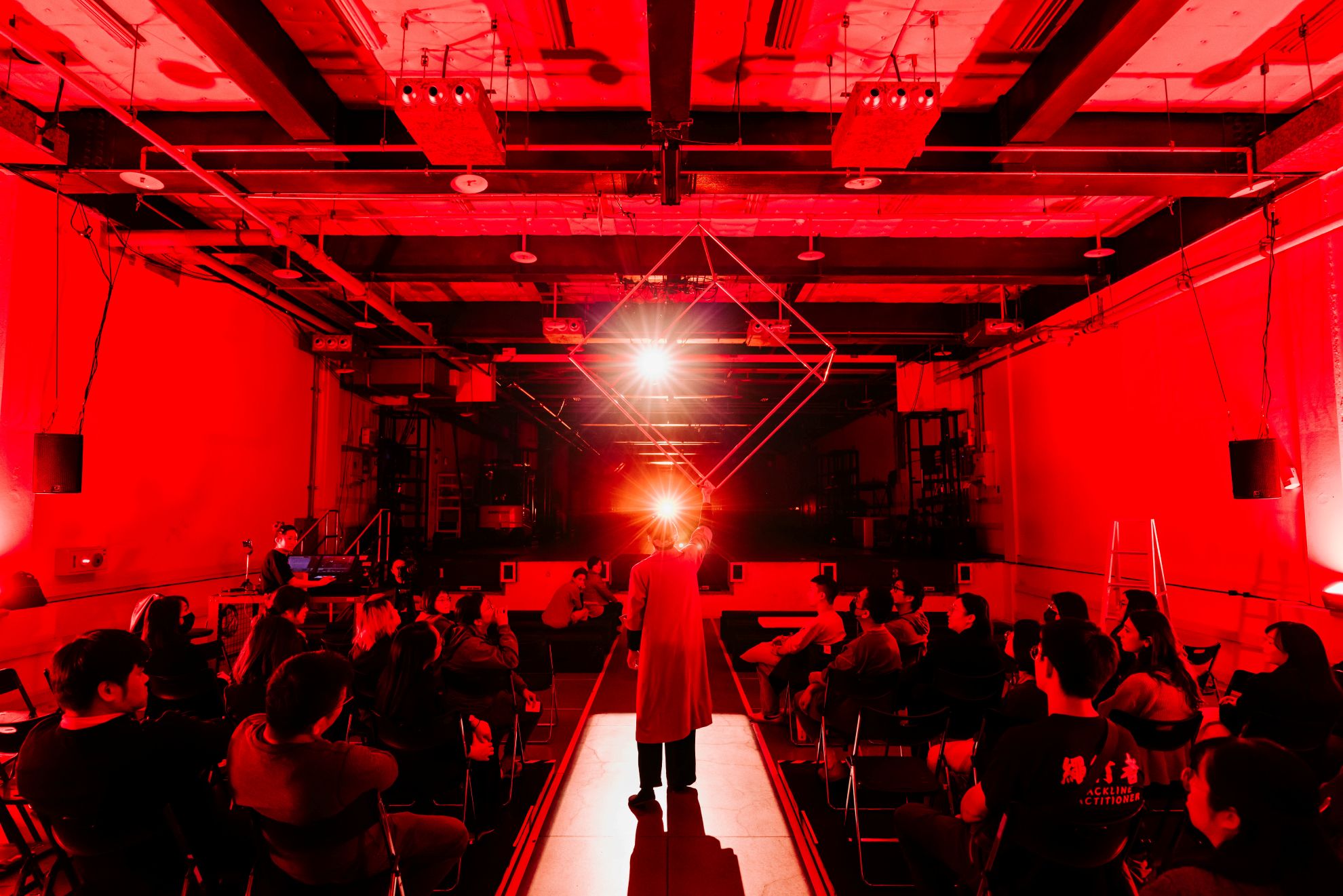第一次抽出的 87 號從缺,第二次抽出的 20 號順利「登基」。他被儀式性地戴上皇冠,並成為第一位選擇座位的觀眾。本以為作品會循著開場所強調的小型社會框架,進一步展開對民主的提問,然而這段「挑選領袖」的流程最終只是個小遊戲,與後續段落毫無連結。也正因如此,這個突兀的決定反而引出了更多疑問:民主的弔詭是否正在此被無意識地呈現?民主的設計者是否本身就是一種(極)權力的代表——能夠恣意制定規則、宣稱民主、並在下一秒停止談論民主?而演者口中的「自願性臣服」觀眾,也被推向權力光譜的另一端;彷彿任何試圖窺探或接近權力之人都不得其門而入,不具能動性,也沒有發言空間。