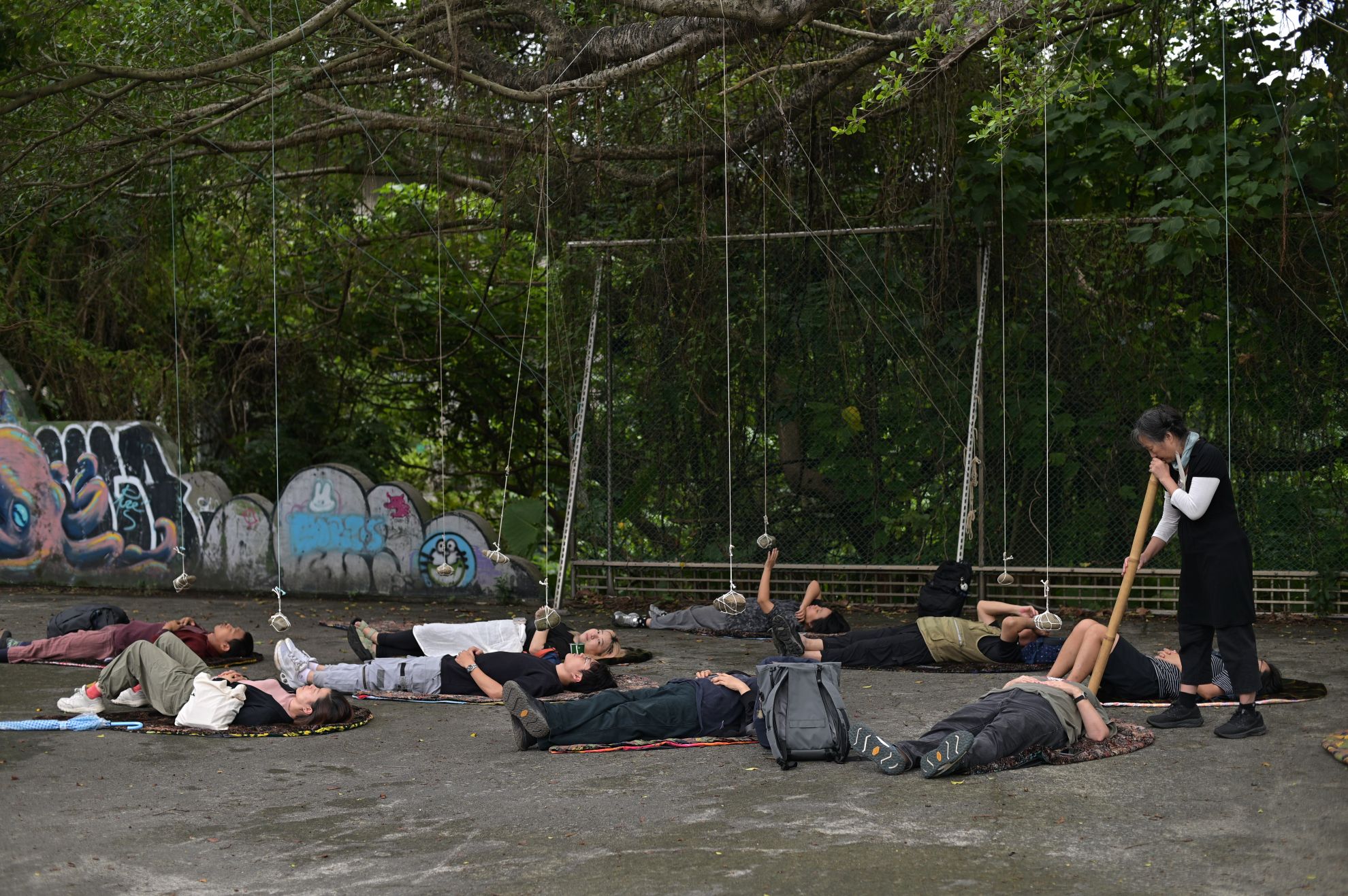 漫遊時間從午後開始,一人一樹的臥式冥想,一顆石頭從樹頂懸垂下來,佔據仰天視野。漸漸當時間感消失、潛入宇宙洪荒之際,冥想結束,眾人起身行卸下縛石,聽著看不見的鼓聲前進,拾級而上,蜿蜒於步道,直到半山腰的廣場停步;只見奇裝異人如祭司,指示眾人堆疊石頭,撒豆於地,如宗教的灑淨儀式,並抄起招魂幡般的長樹枝,上面掛滿白瓷湯匙,發出異常清脆的器響。不料眾人隨即被引導進屋,在一卷長布上以石推筆,留下石頭的塗痕,然後繼續下半段走向低處的漫遊。