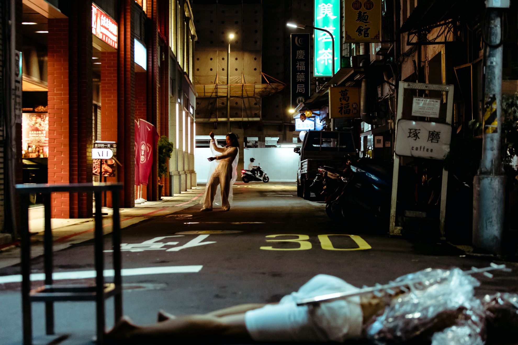 傍晚七點半,商業熱氣已消退,食物氣味猶殘存,街燈、車燈和騎樓頂的白光燈,開始有了巨大存在感,四名穿著透明雨衣白色內搭的人形體,堆疊出現在永樂市場停車道入口,鐵門已拉下,自然而然形成一種無人地帶。地燈從裝貨塑膠籃中打出格柵光,另一顆燈和音響播放器一起隨表演者遊走。人體雕像瓦解後,四人如水流動,或二或一,呼吸,走路,或躺或蹲,越過樹叢,徘徊溝邊,蜷曲於柏油路上,卸除表演性,像不斷吸收環境的訊號的單純接受器,並以身體釋放,當下,「我」恍如介質,但「我」也因此而存在。