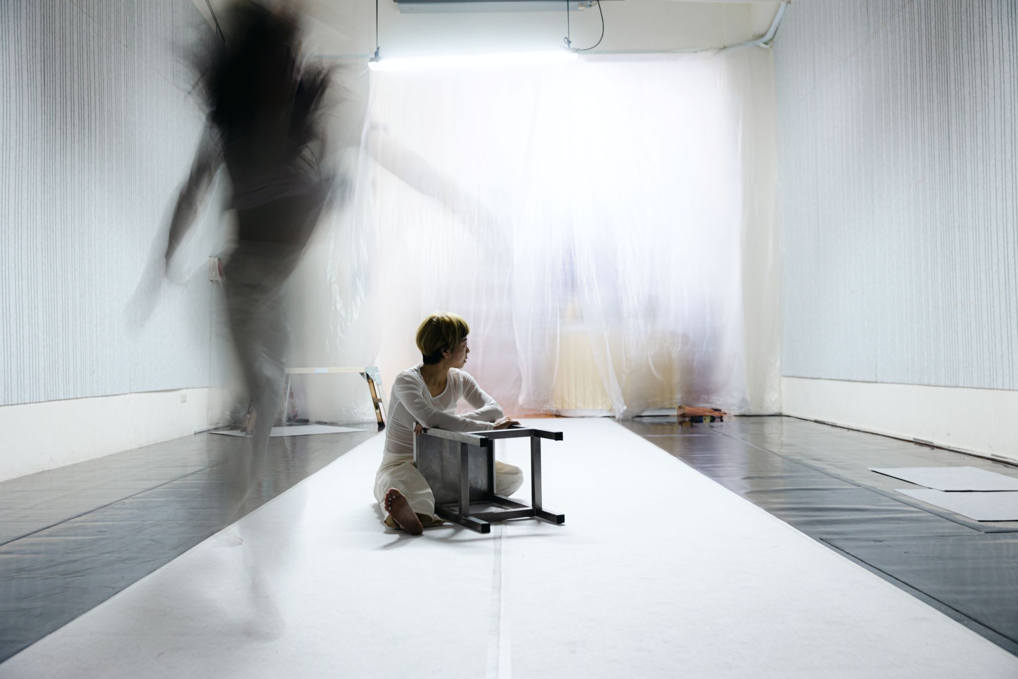 或許因呼應去年大稻埕國際藝術節的主題:「AI CAN'T DO」(AI不能的),有限的物件——鋁製A梯和、方型高腳凳、折疊條凳——發出冷灰金屬質感,但它們彷彿與舞者結成接觸即興的伴侶,分不清誰被誰給定義,人的創造物與人自身,失去主客關係,共同形構畫面。走入迪化街三樓的大樂房,養生膠膜和白紙鋪出同樣冷而淡漠的色調,吊在空中的長燈管也加入敘事,音樂低限猶如為了襯托緘默而存在,有時乾脆安靜裸退。不像語言敘事具有明確的指向性,這樣的身體敘事,因此擺脫定義的局限,像開放的象徵系統,由每一個同時在場的人,各自完成體驗與解讀。這或許這正是AI無法複製的部分:無法被數據化的感受,相當接近於「活著」的體驗——這可能才是人類特有的部分,同時也是極為有限性的存在——脆弱、短暫,無法以語言形容,僅能以身體存取,然後消隱於意識底部。