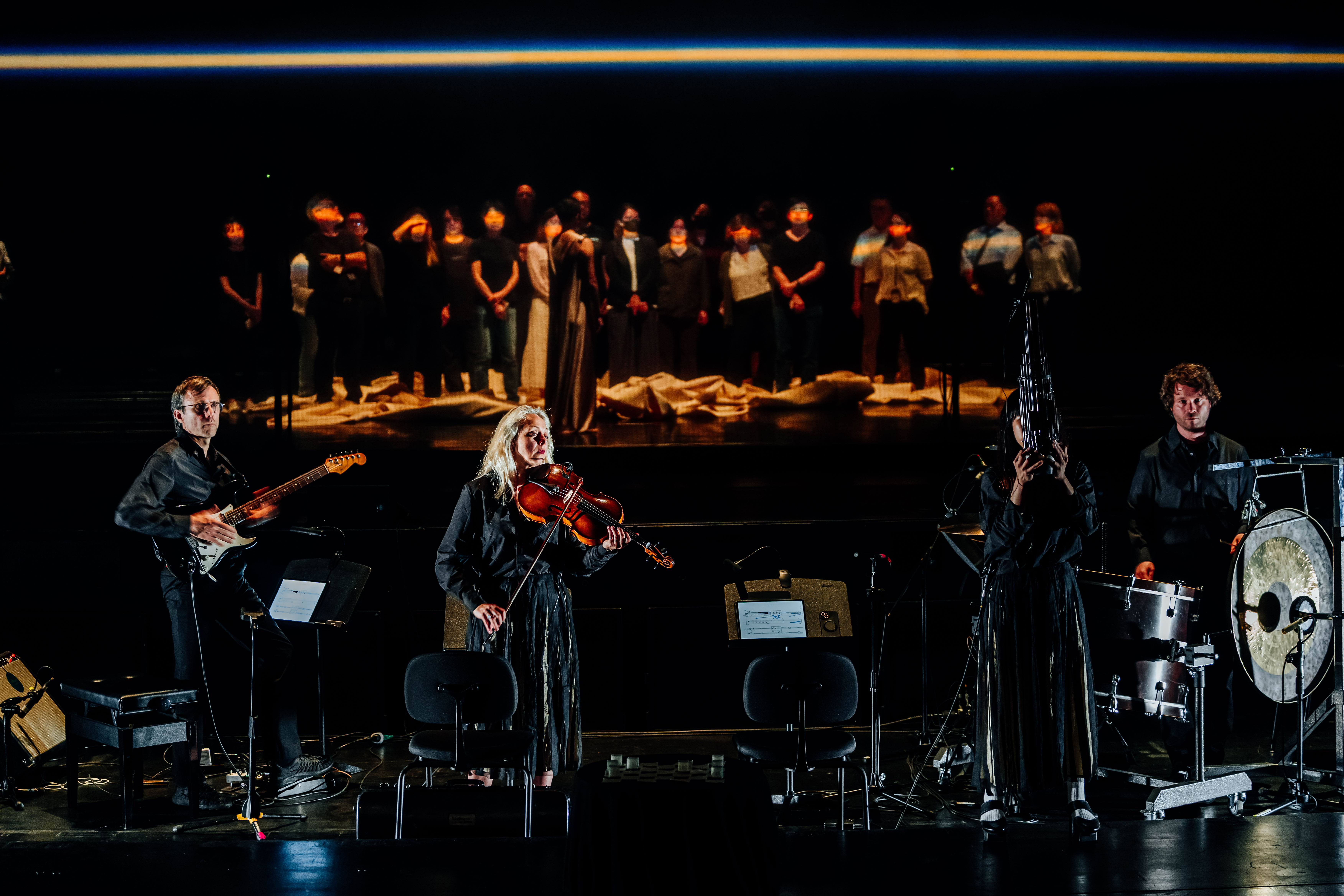 在音樂設計上,作品前段由斯圖加特當代人聲團的碎片交織而成。隨著可移動的白色網格因舞者的摺疊而縮減,聲響素材從人聲漸次過渡到各種質地的噪音,最終導入現場演奏者的介入——比利時強音當代古典樂團與笙演奏家李俐錦,以小提琴、擊樂、電吉他與笙交織出極具異質感的器樂聲響組合。