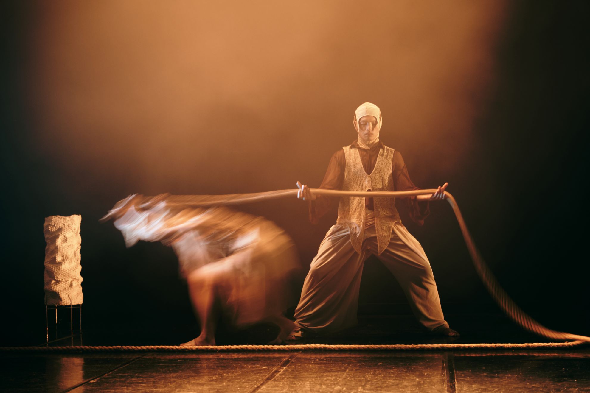 當反覆執行取下、踏步、編織、拉緊、再懸掛的動作,形成一種近似祭儀的勞動循環。重現了編舞者在田野調查中,拜訪臺灣「注連繩」技藝師傅李龍老師的感悟——手腳併用、由纖維搓揉成繩索、編織技藝累積的厚度,化作作品向下紮根的意象。此刻的意象體現了人與土地最原始的交感:那種來自土層的粗糙與最辛勞的勞作。若麻繩是在意指「注連繩」,其核心用意在於區隔聖俗的結界,那麼在作品中則更像是包裹生命的「羊膜」,亦是連通母體(大地)的「臍帶」也是與維持關係的「繩索」。成為訊息交換的媒介,彰顯出根系與血肉互為表裡的想像——既是養分的輸送,亦是人與人、與土地無法割捨的依附。