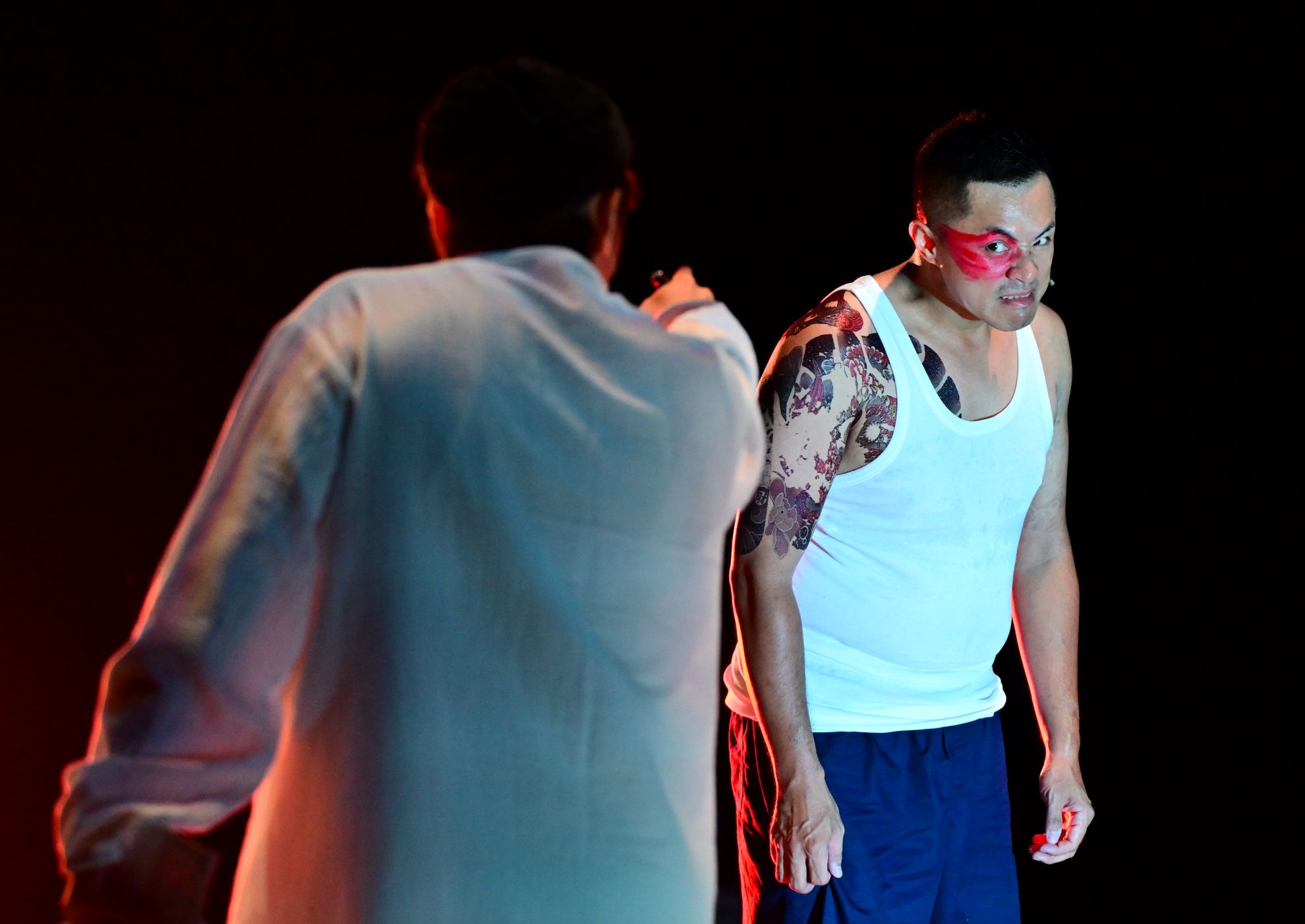 遭逮的阿傑,褪去花衫換上灰色獄服,沉默不語,轉瞬間,舞台成為關押的禁閉室——一個現實生活中本應最無能動性的地方,卻是阿傑心理活動最豐富的展場。編導安排神秘人阿猴(詹佳穎飾)穿梭於禁閉室,是製作中最富有心理意義的亮點。阿猴的扮相,處於歌仔戲演員上戲前或下戲後的裝束,身穿白衣,臉上妝容卻不知歸屬於何種腳色行當。卸下腳色行當的中性狀態,卻使阿猴在多種人物身分之間穿梭轉換:說書人/算命師/心理師/歌仔戲團團長/阿傑父親。從心理的角度而言,可以說阿猴是阿傑無意識的多種投射。