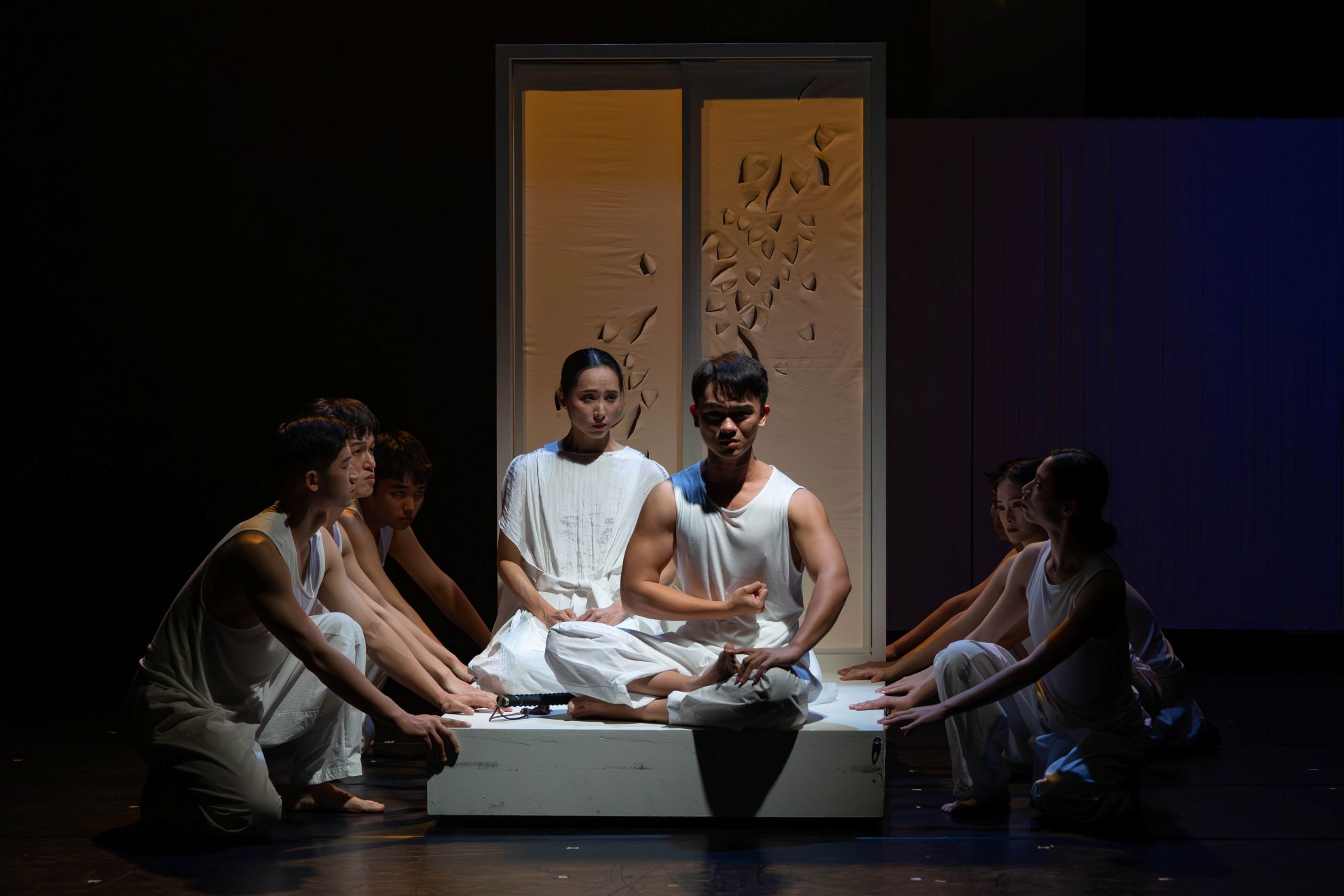 值得玩味的是,導演安排五位男演員與三位女演員,分別共同飾演中尉與妻子。透過屏風的遮蔽與流動,演員們在「間」的隙縫中交替現身,讓角色的肉體超越了單一的個體限制,化身為精神符號,在舞台上不斷解構與重組,彷彿亦暗示,在這場殉道中,肉體是可以替換的容器,唯有貫穿其中的意志才是靈魂。