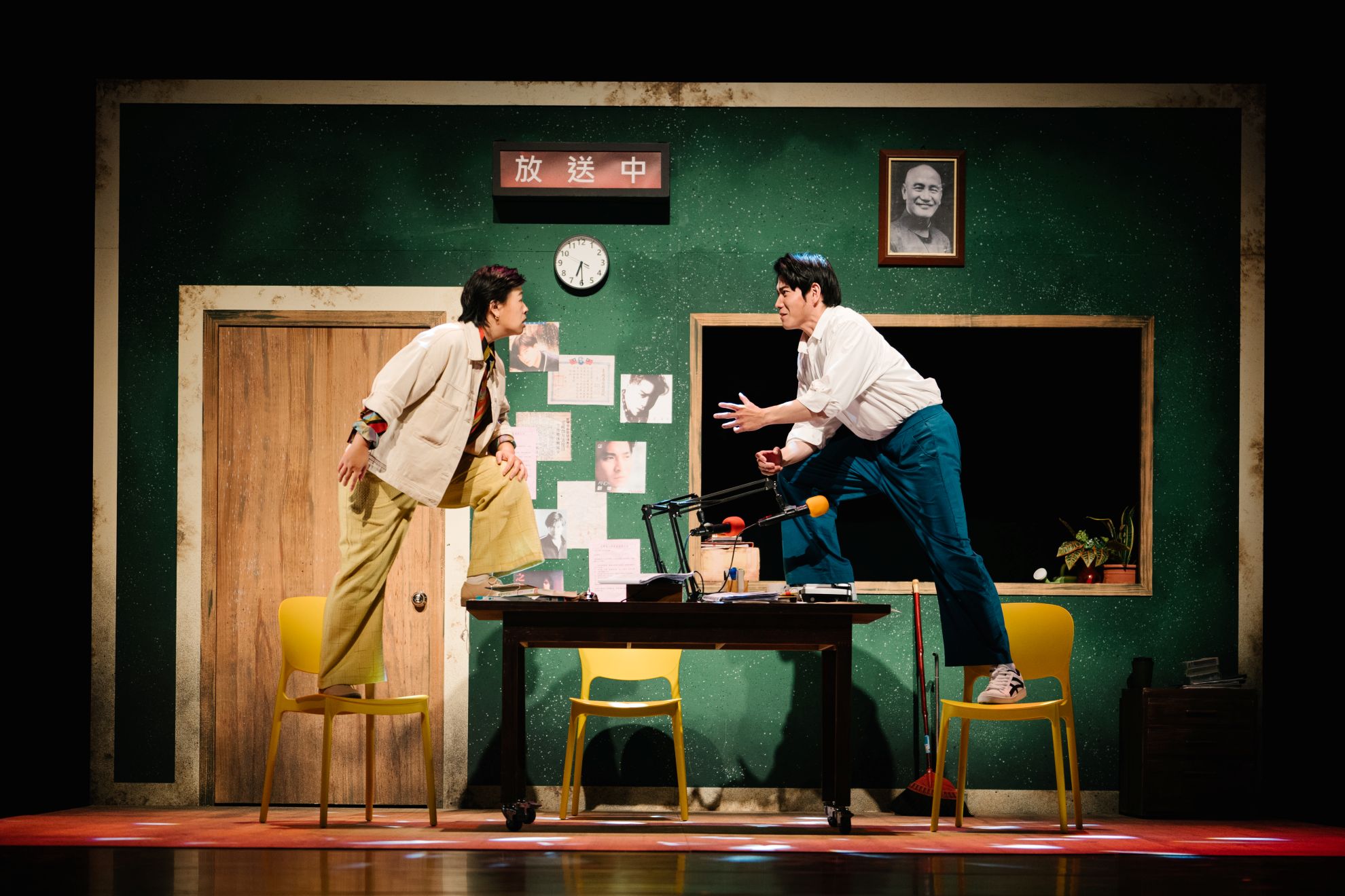 為了完整呈現這種痛苦的根源與對抗的必然性,劇作以歷史事件為依據,開啟「聲音的戰場」。劇中開場以「千島湖事件」(1994年)【2】帶出時代背景,透過集體敘事呈現當時社會對言論管制的不滿與對自由的渴望。這段開場為整齣戲建立了清晰的對立結構:一端是官方電台的語言審查與內容管制,另一端是地下電台的自由與野性。這是語言、文化與靈魂的角力。有了這樣的時代脈絡,地下電台「內容包山包海」的節目,包括時事評論、社會議題、禁歌播放、民間聲音,便不再只是「反叛」,而是在壓抑中必然的出口。