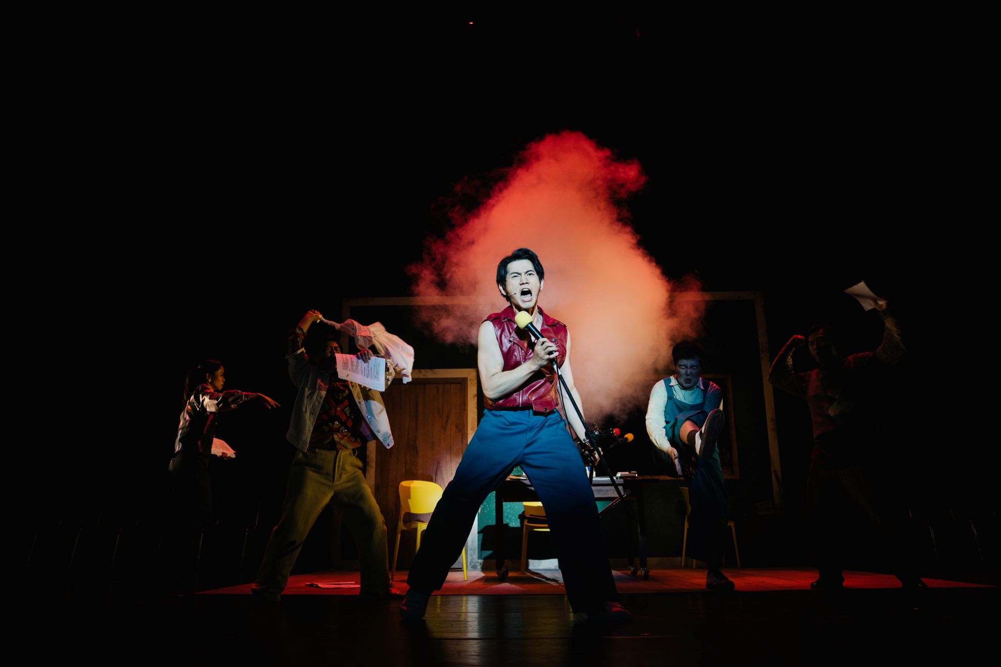 在劇場調度上,演員的身體爆發力成為戲劇張力的凝結點。飾演李妙玲的蔡孟純展現了高難度的身體與聲音技術整合:她不僅要將聲線從需要強大氣息支撐的高音演唱,瞬間、流暢且精準地切換到需要清晰度與敘事感的口白,更在歌隊的集體托舉中一躍升起,拋出「你就試試看!」的挑戰。她以身體的爆發力完成高難度的空間重置,同時用強勁聲線展開歌唱實力,將角色的反抗意志推向高潮。而飾演新生代主持人蔡詩文的朱殷秀,則成為李妙玲最具張力的對手。兩人在歌唱與敘事的段落中聲聲逼進:蔡詩文代表著渴望打破規則、衝破框架的能量,她的聲音充滿挑釁與不安分;李妙玲則承擔著父親志業的重量,在傳承與突破之間掙扎。這組對手戲不僅是兩個角色的對話,更是兩種世代、兩種路徑的碰撞。