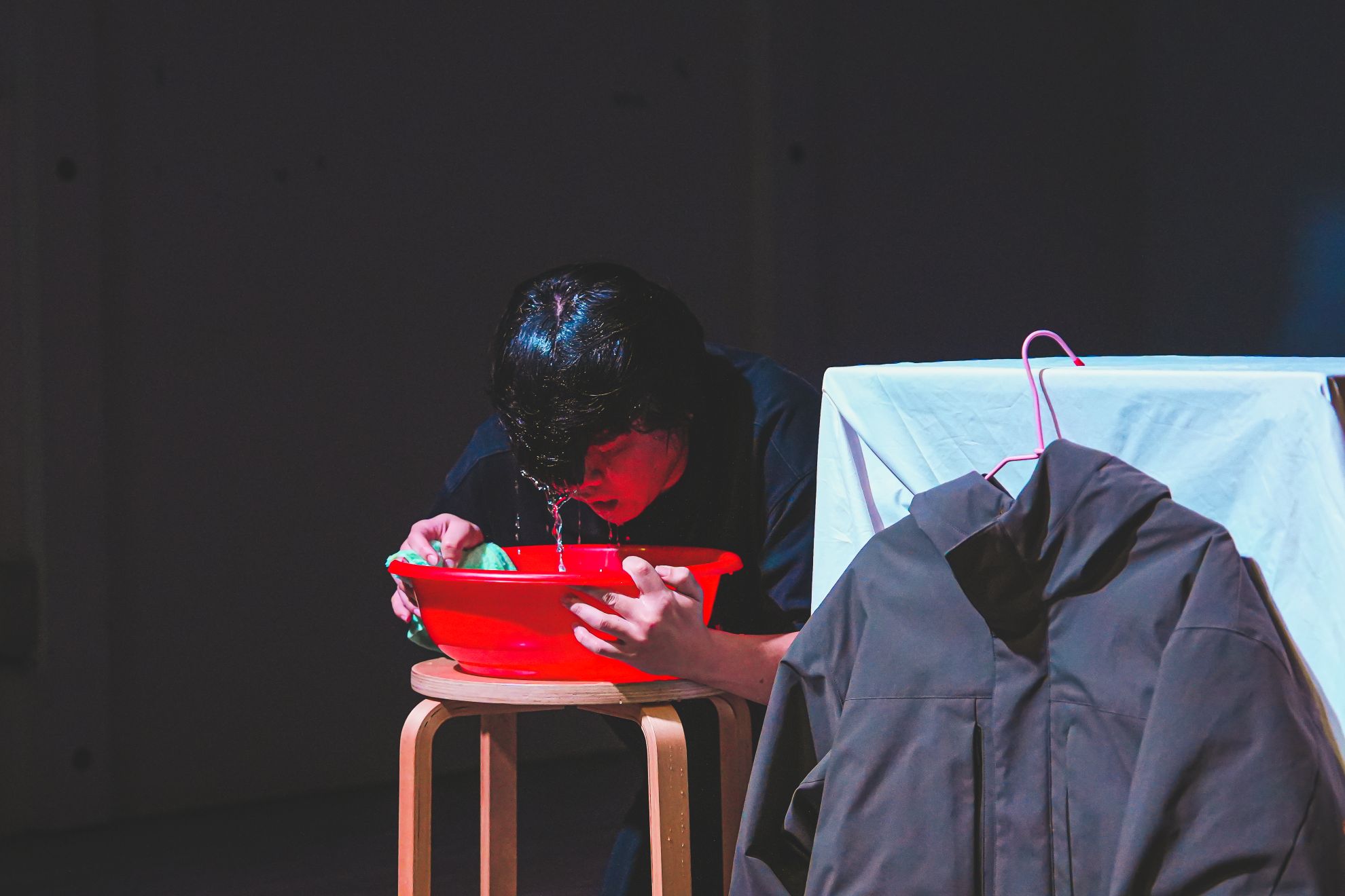 在極簡的佈置裡,臉盆中的水、新聞報紙、以及衣物轉化出的父親身影,都成為記憶的觸媒。一段他將臉沉入水面、以衣物營造病房裡的照護場景,這些行為不求戲劇張揚,而是以最直接的身體姿態讓記憶被看見,接著在道具、聲音與行為之間的連動,使這場獨白形成一種貼身的觀看結構。