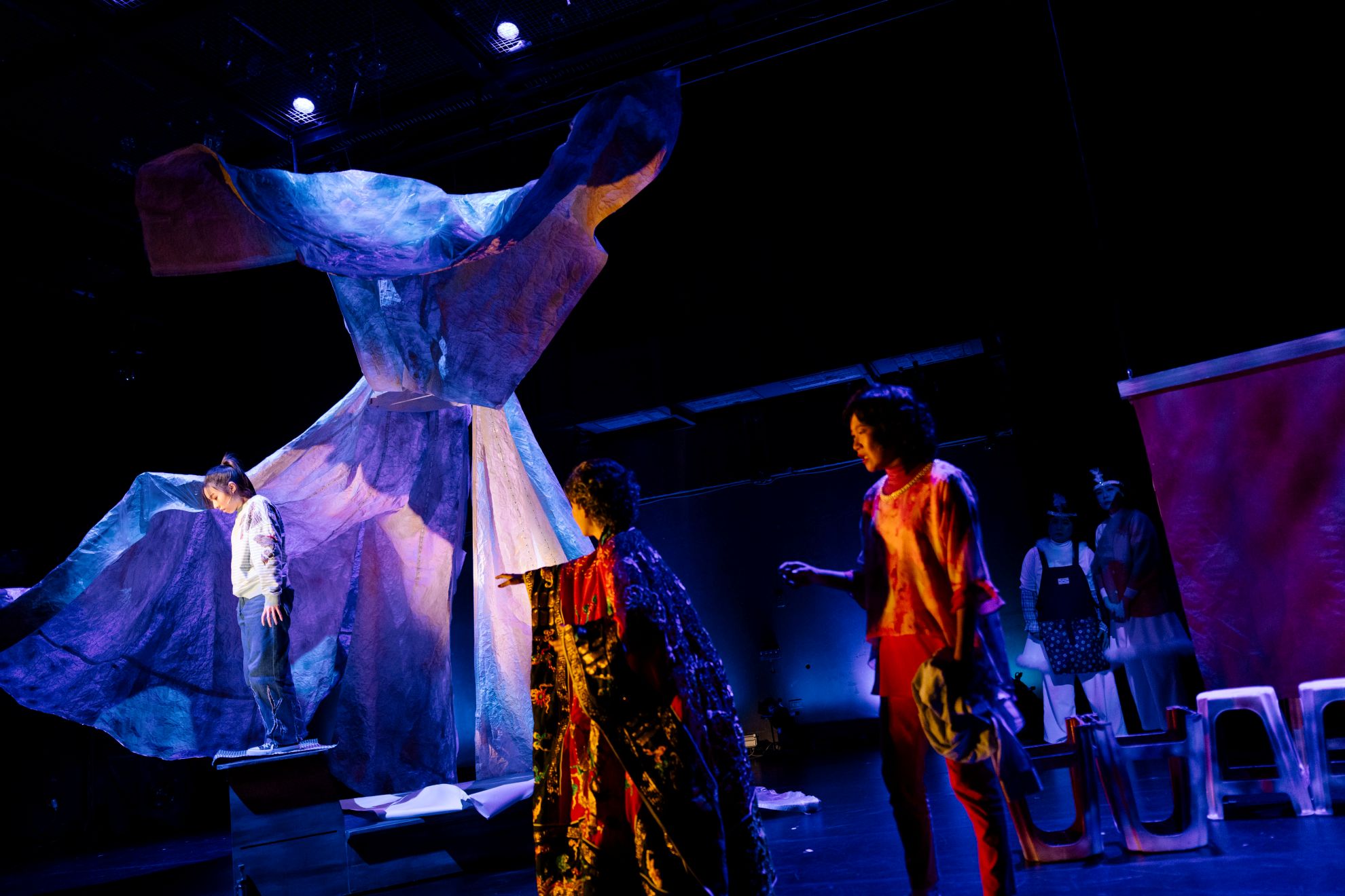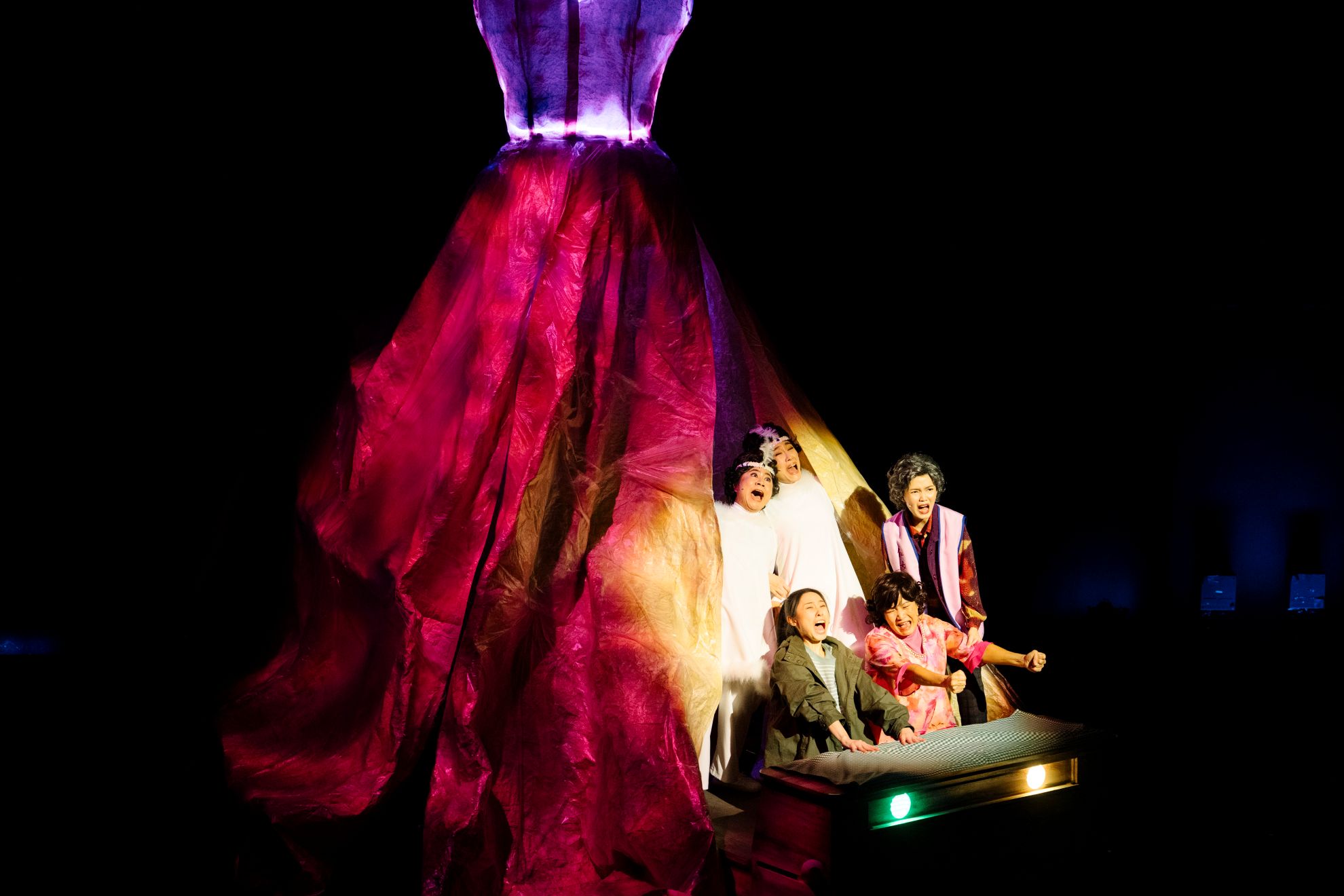創傷後的封閉、失語狀態,很大程度來自於支援體系的失能。讓我們再次回到舞台上具有多重意義的女性裙擺——裙擺遮蔽著女性私密處,是最常遭受攻擊的標的,卻也是生命/身體的來處。這裡可以是保護,卻也是不被理解的囚地。劇中以三代母女關係、外加象徵庇蔭的姑娘神靈,指出女性情感連結時常依然受限於父權:【4】如母親陳美秀始終不能原諒阿媽明知道她被爸爸侵犯,卻還不離開這個男人;又或者,阿媽終身供奉姑娘,姑娘卻未能保佑她平安無事。至於阿媽,想要保護自己女兒,但無力起身反抗根深蒂固的家庭制度,只能偷偷在老公食物下藥。