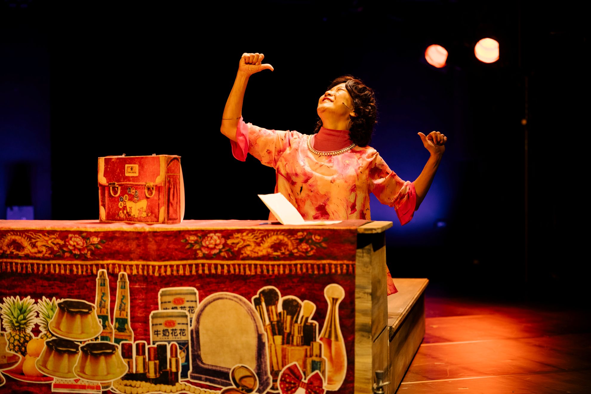 然而,即便編劇不諱言創作靈感來自「長輩說不結婚就要變成孤魂野鬼」的親身經歷,【1】《仙女三重奏》卻也為「民俗信仰」開了一道小小縫隙。面對難以言喻、說出口又不被理解的性創傷,《仙女三重奏》改採迂迴途徑,巧妙疊合源自佛洛伊德理論的潛意識夢境、【2】心理分析、書寫療癒(劇中以剪影與紙張呈現)與乩身通靈。舞台矗立的巨大女性身型,寬闊裙襬時而呈現自我封閉空間,時而開展為奇特屋頂,營造似夢似真的場景氛圍,藉此讓陳美秀與真真這對母女慢慢深入或各自、或交互的記憶,回溯傷害及隨後延續的心理孤立。