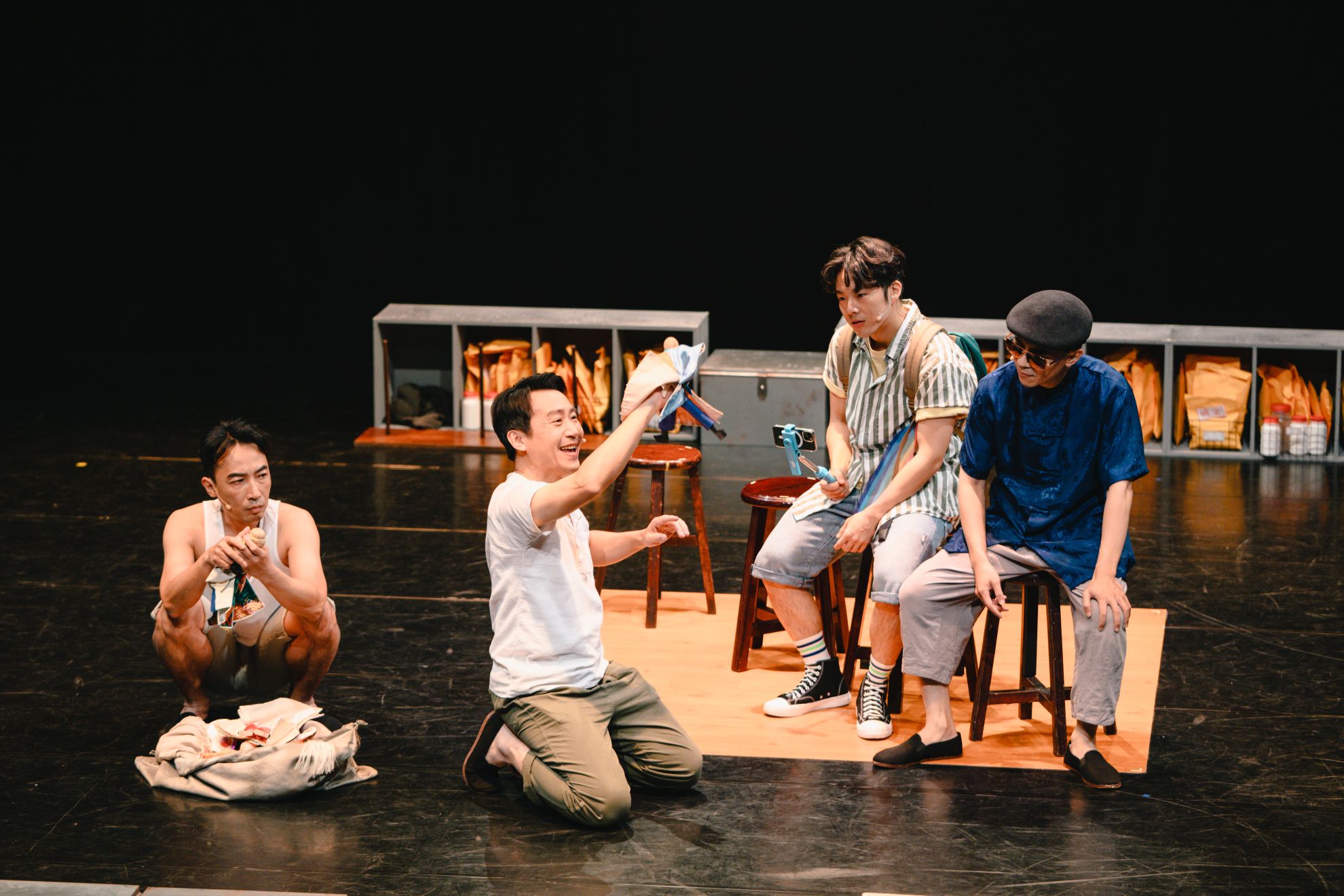 編劇在劇本中筆下的人物眾多,少說有三十餘個以上,所描述的場景同樣繁多,甚至有「現代」的場景以及在講述回憶時的「過去」場景。相信如果只單看劇本,腦海中所浮現的演出畫面必定是眾多演員在舞台上以及演出過程中換景頻繁。但在蘇洋徵導演的導戲下,透過場面調度以及演員自身傑出的表演功力,讓六位男性演員透過肢體動作、聲音、語氣以及語言的詮釋,在舞台上演活男女老少皆包含的三十多位角色;且角色切換如行雲流水般流暢,像是上一秒扮演阿文親友的演員下一秒圍上圍巾,手握一把扇子,身體姿態放低,語氣提高,成為街上販賣保健藥品的阿婆,轉眼間就做好角色切換,且不讓觀眾感受到突兀。另外阿文在拜訪與貓仔有關聯的人物時是屬於現代的情節,但當那些角色在講述回憶時,場上就會開始演回憶的片段,而阿文仍然在場上觀看,讓現代與過去融合一體,使得過去的回憶歷歷在眼前,非常生動。而且透過導演巧妙的場面調度,讓現代的人與過去的人在不同時空下有所互動。劇中最明顯的畫面就是阿文在與一位師公喝酒,師公在講述回憶時,年輕時的他與貓仔也正在場景中喝酒;每隔一段四人就會一起拿著酒瓶齊同乾杯,讓不同時空下的人物在那一刻有所連結。也透過場面調度,將舞台上幾張實木圓凳與物品做簡單的變化,就變化出各式的場景。舉例來說,有一場戲是要演布袋戲,於是人物就將圓凳疊起來,成為布袋戲演出的舞台,同時也做了場景轉換。