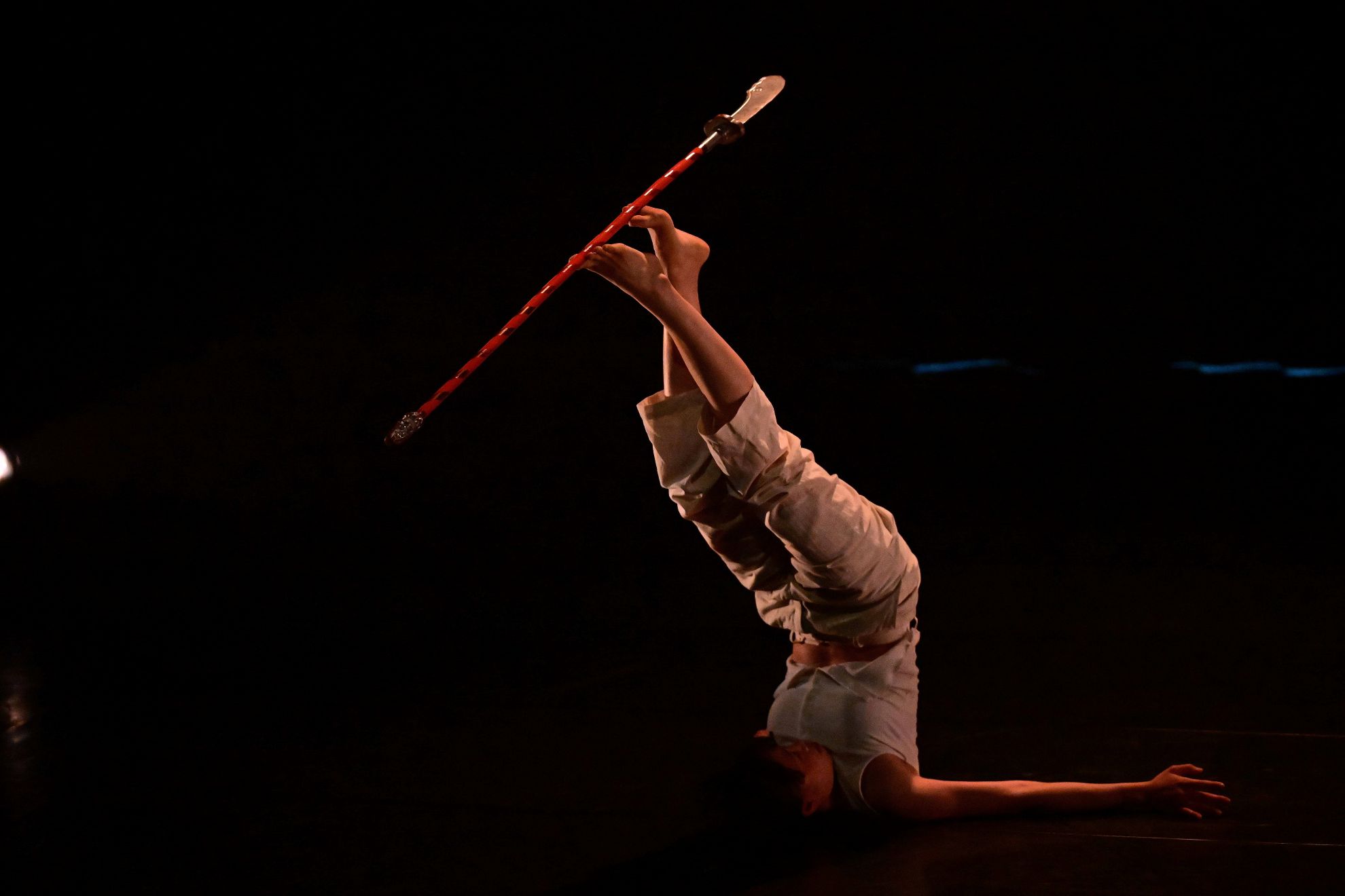 若從黃祺芳的作品回望整場比賽,「什麼是民族舞」始終未曾也未必能獲得一個共同的答案。置身於以比賽為核心的「民族舞」創作現場,可以清楚看見參賽者如何竭力梳理自身的舞蹈身體脈絡,召喚體內的民族因子,並將其轉化為個人的創作語彙。然而,黃祺芳卻選擇反向而行,回到身體與大刀的身體本身,以尚未被命名的互動取代對既有符號的解構。這樣的實踐不僅為民族身體開啟另一種切入方式,也進一步逼問:若暫時鬆脫「民族」這一框架,身體究竟還能如何存在?