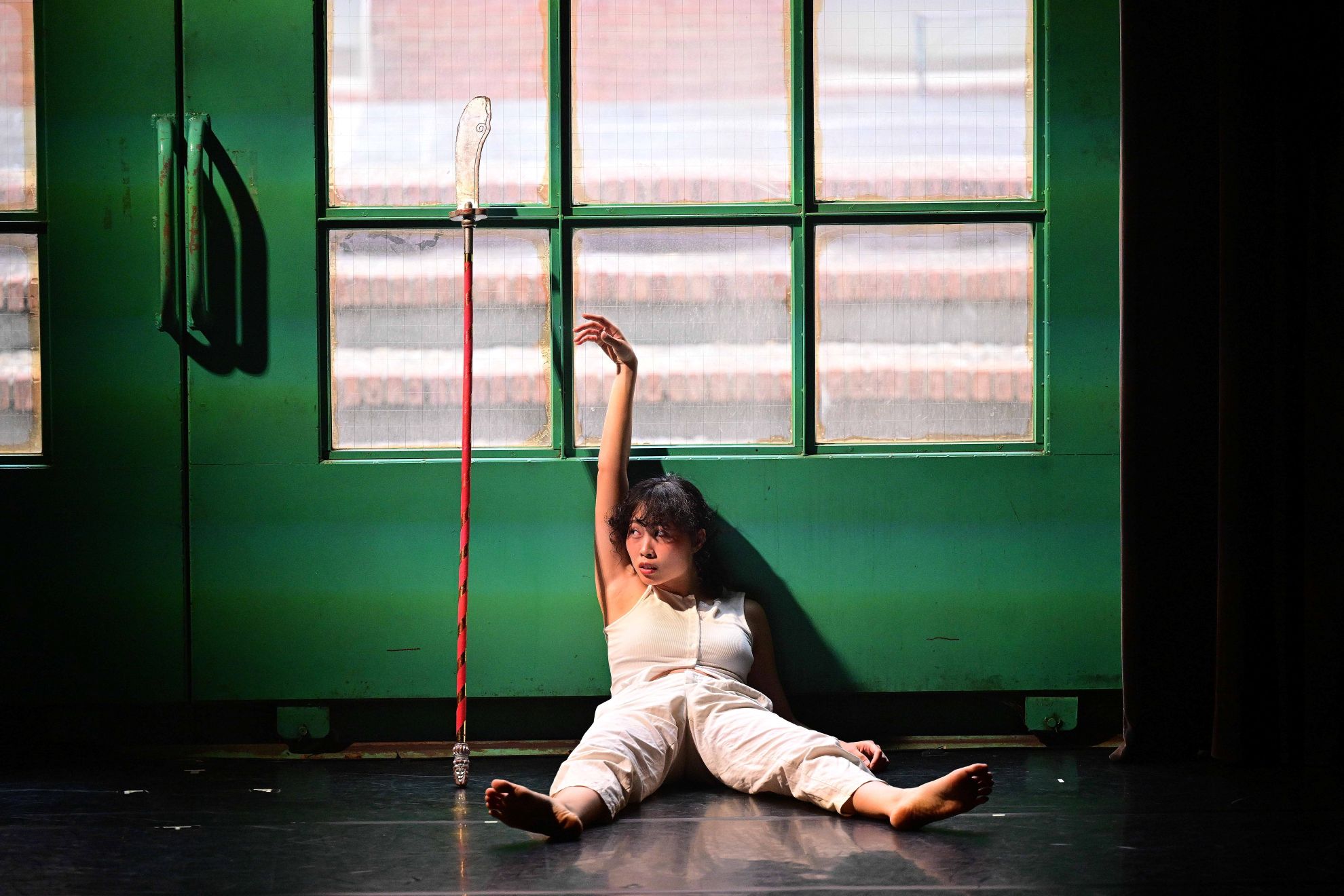 大刀進一步被置於她的口中、腳底與髖部,這些超出常規的互動,使觀看得以暫時脫離大刀既有的語境,轉而關注互動本身。此時的互動並非為了生產或再造意義,而更像是一種仍在試探中的關係生成。最終,大刀與黃一同躺在地板上,一同倚靠在大幕後的窗框前。起初兩者高度相當,隨後黃緩緩下蹲,降至刀頭尾端,呼應她在作品開頭所言——一把大刀最合適的位置,應在使用者眉心高度——此處卻反向提問:對一把大刀而言,何種高度才是合適的使用者?