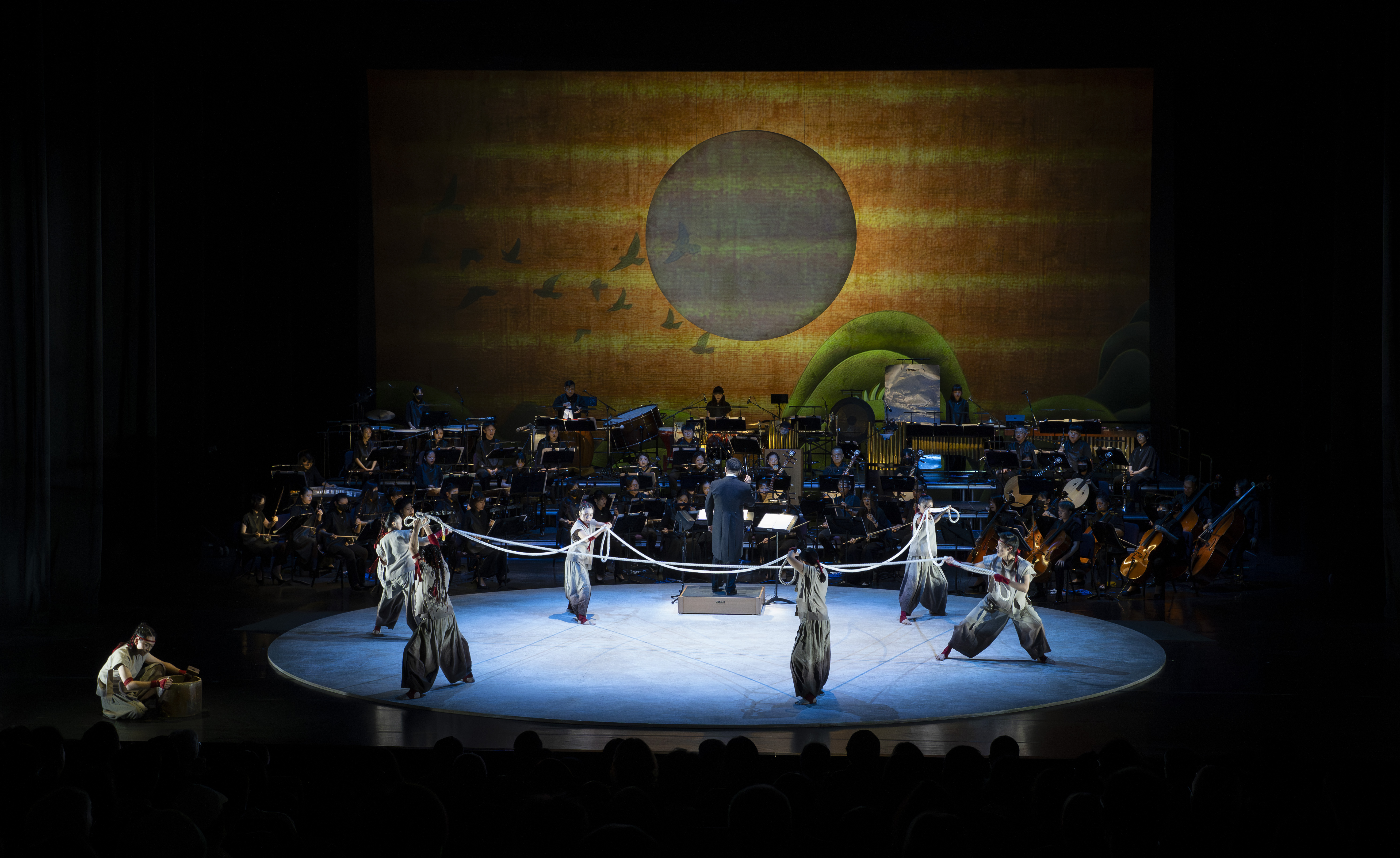 臺灣國樂團近年的劇場化音樂會製作,其畫面分割及舞台配置大同小異——國樂團維持一般音樂會的座位配置,獨享上舞台;後方是滿版的背投影像;下舞台則是演員及其他表演者的演出區域,並且舞台道具的設計偏向簡約輕巧,避免遮掩樂團、指揮、或影像。從《魔幻時空大稻埕》、《甘露水》、到現在討論的《鼕》皆幾無二致。