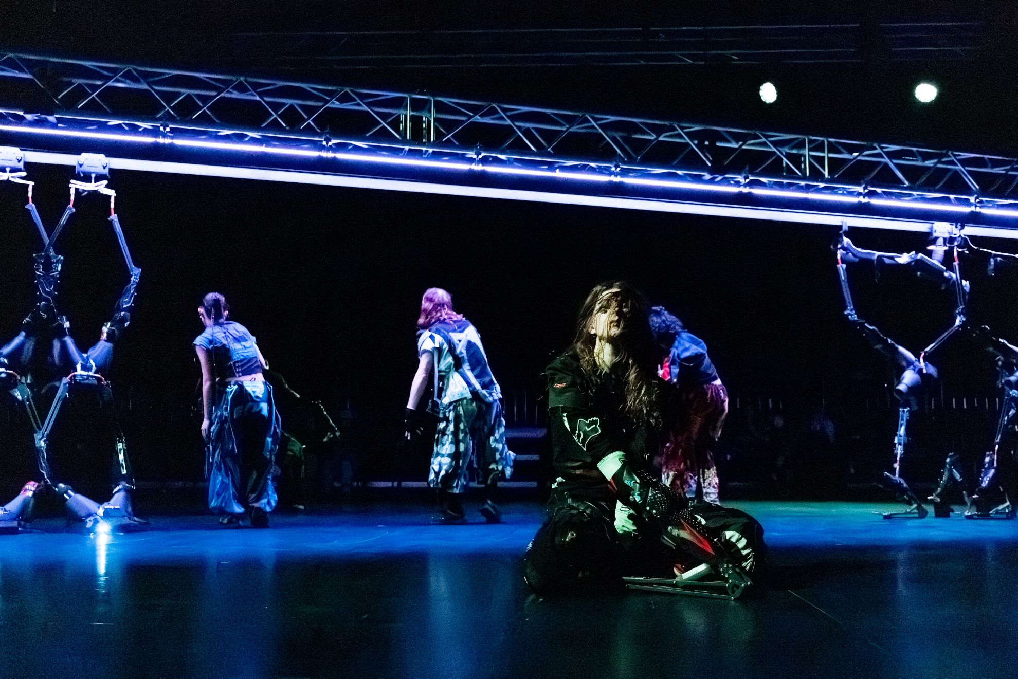 當後段舞者逐步卸下部分機械裝置,他們的身體不再完全依附於外骨骼的節律,而是開始以自己的力量重新校準動作、感知空間與集體節奏。緊接著,六位舞者在軌道下排列組成如「機械龍」般的集體形態:肢體相互疊合、延展,呈現出既超越個體又整合外骨骼延展的後人類形象。這一瞬間,作品清楚展現了身體如何在技術介入後重新獲得主體性:不是回到純粹的人類形式,而是以人與機械的混合體,重新書寫身體的能量、邊界與存在感。