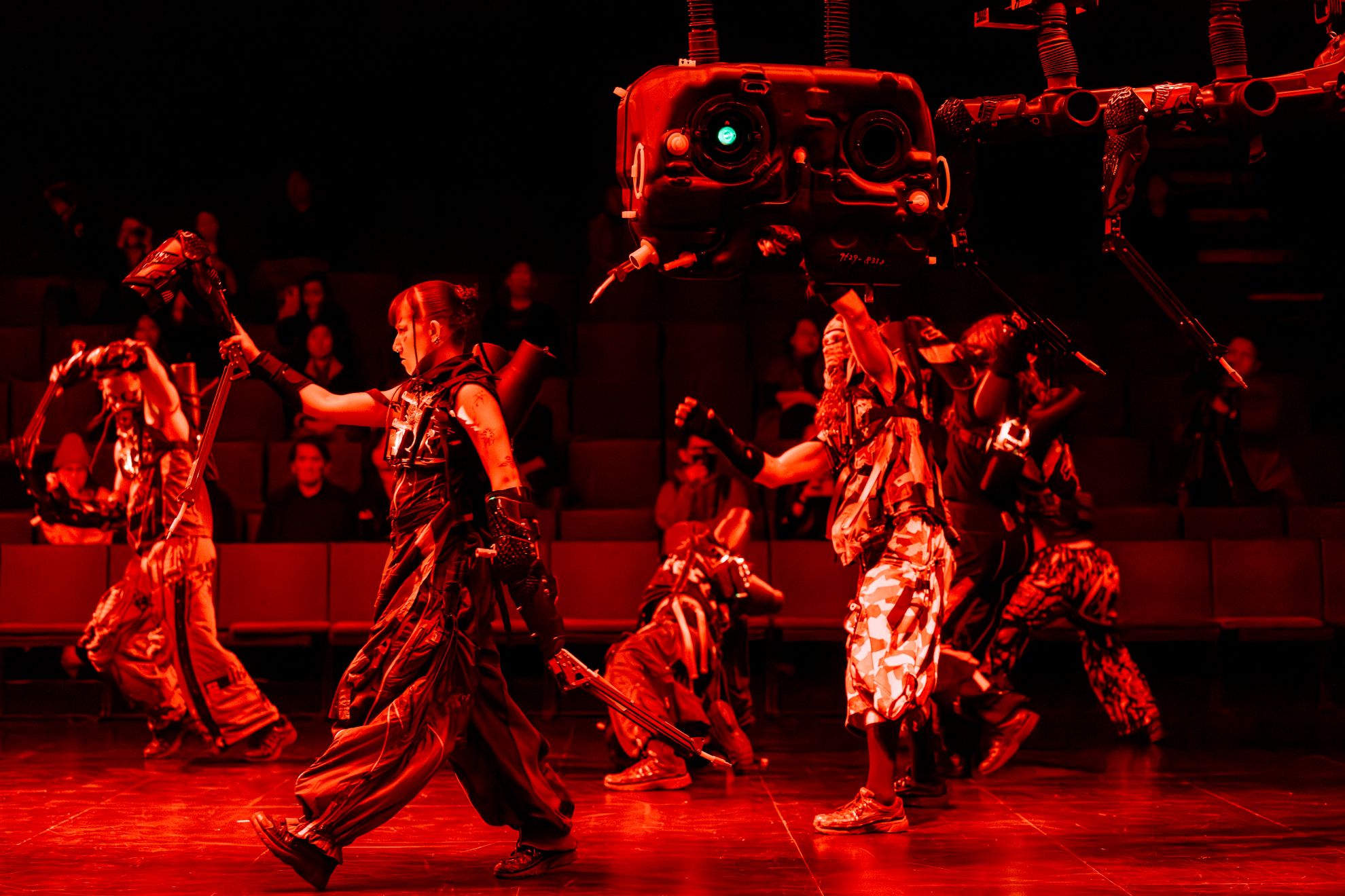 舞者在空間中疾速換位、穿梭全場,甚至多次站上高處的軌道,這個高低差並非作為舞臺效果,而是明確標示出「權力位置」的變動。當舞者攀上軌道,他們不再只是受技術牽引的身體,而成為與機械共享視角、甚至共享指令源的存在;站在下方時,身體則再次回到被調度的位置。高度因此成為一種動態的權力地形圖:誰能與機械並肩?誰必須服從其節奏?作品將這點處理得巧妙,沒有明講,卻透過動線、速度與高度讓觀眾感到一種被重新分配的主體性。