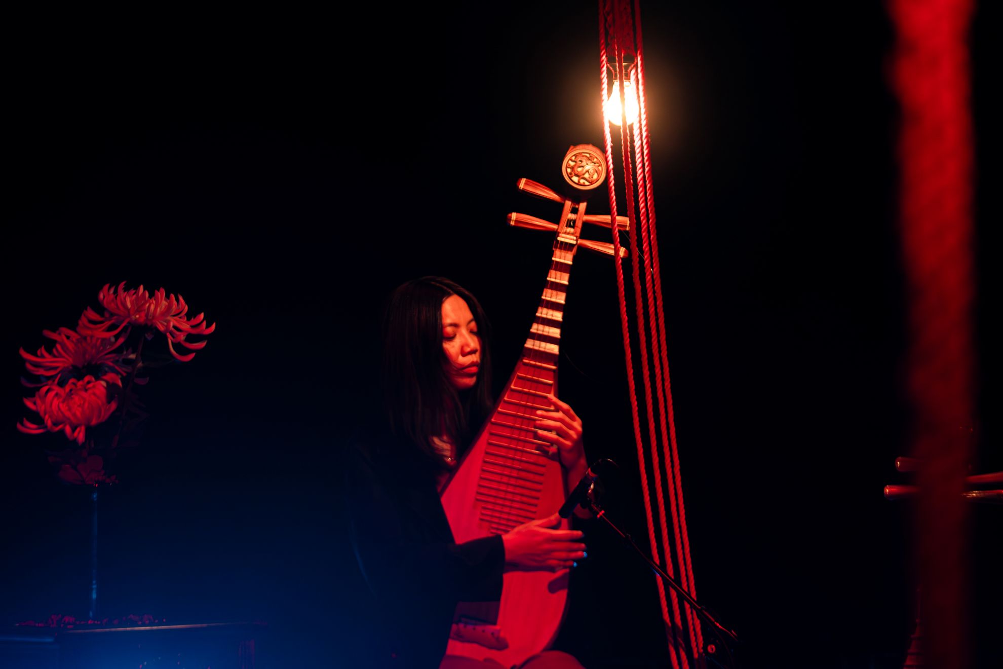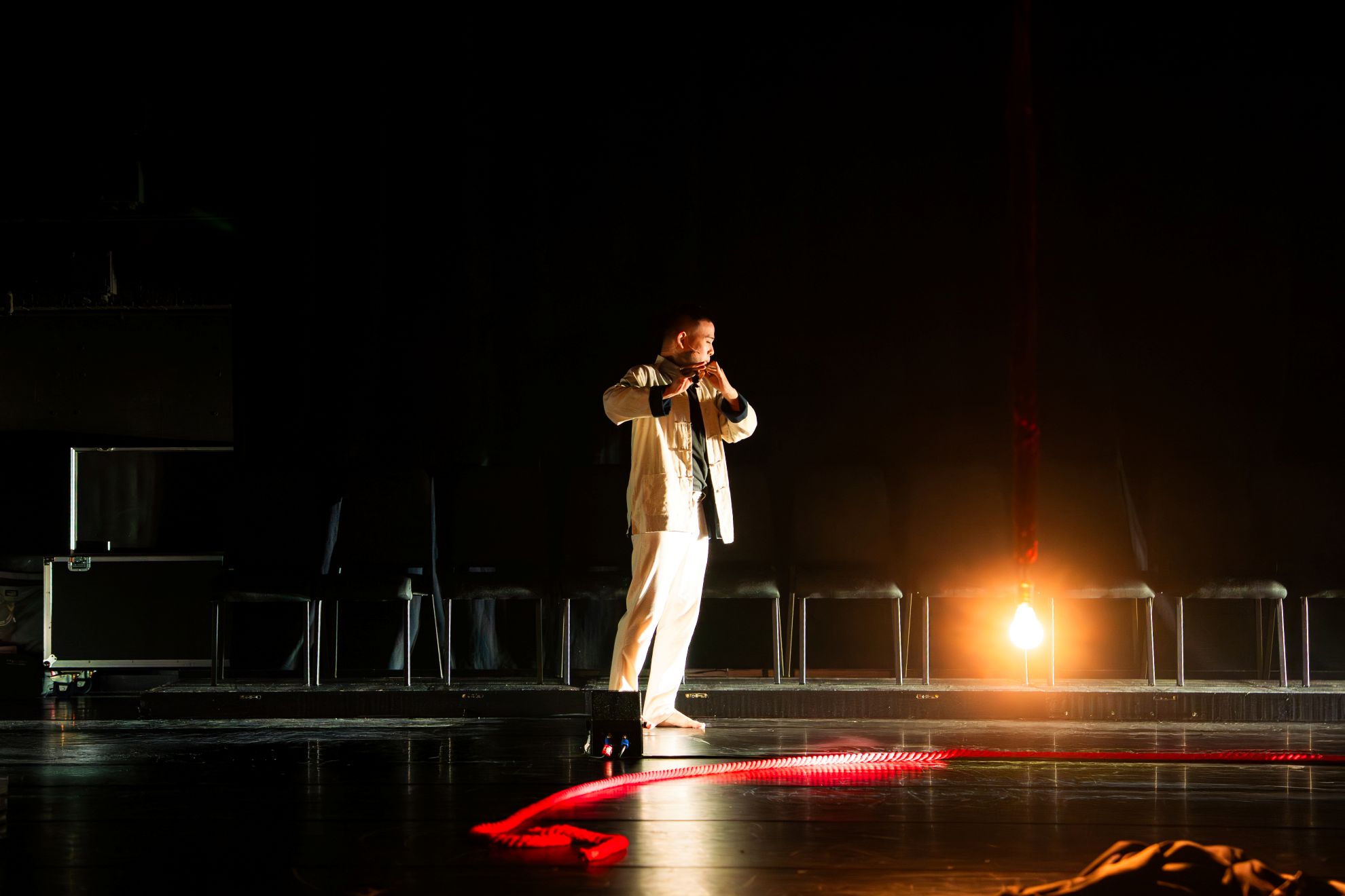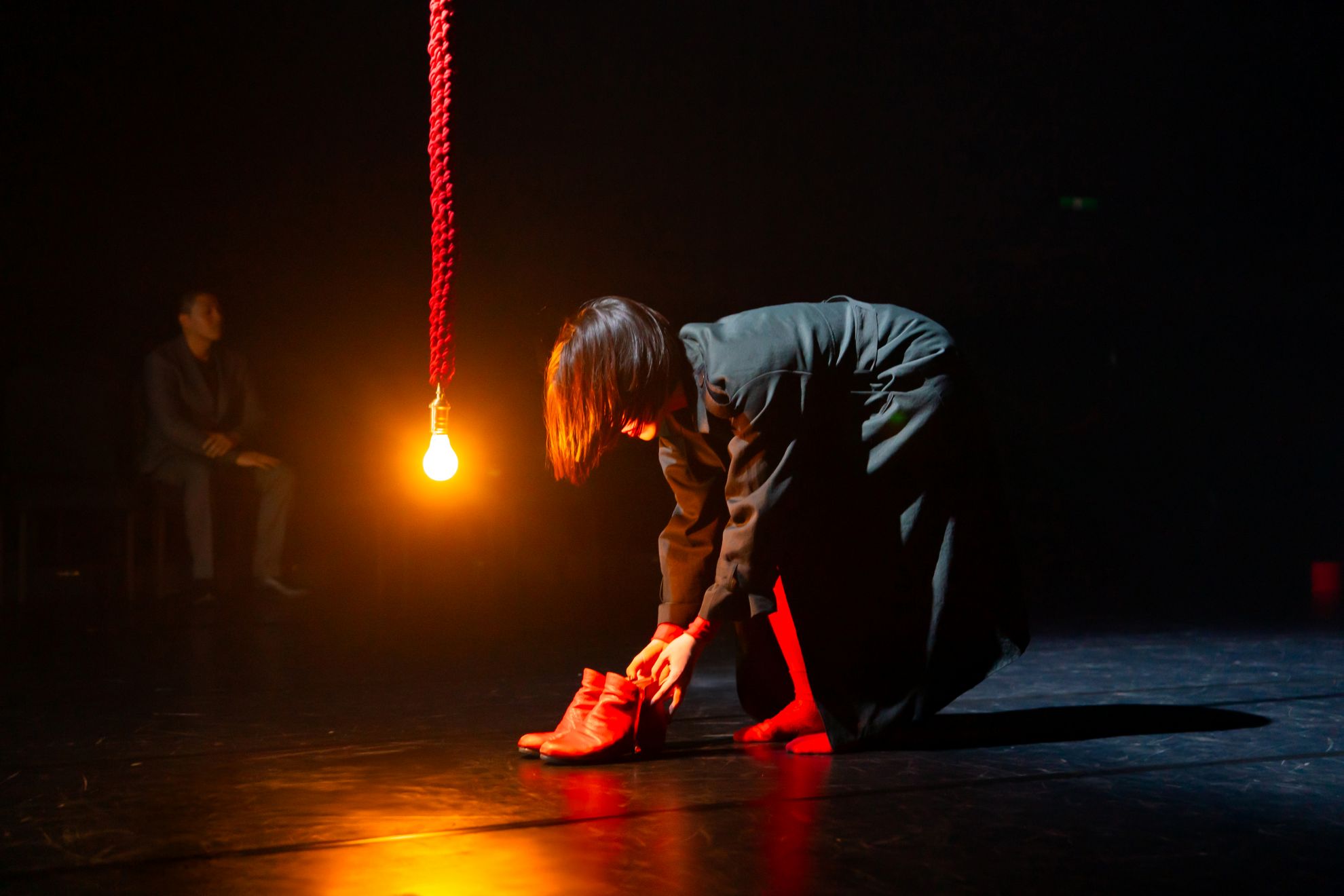 昏暗燈光下,黃至嘉身著黑色風衣,拖著一個大行李箱走進劇場,首先遇見的是一盞用大紅色的繩索自上方吊掛而下的鹵素燈泡。她緩慢的脫下短靴、打開箱子、拿出一團一模一樣的紅繩,在沒有舞台高低差的實驗劇場框出一個「表演區域」。在這塊外於現實的空間裏頭,黃至嘉脫下大衣,露出裡頭如紅繩燈影一般的赤紅身軀,啟動肢體,吐納樂音,呼喚MARY 李降臨於身。