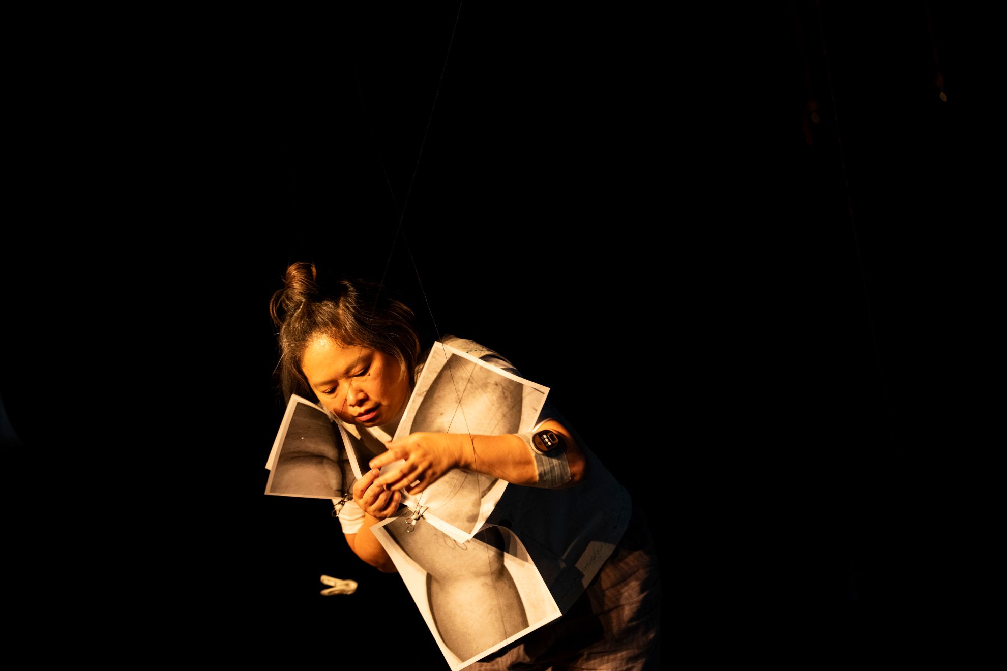 受傷而僵硬,彼此無法在背後相碰的手,在拿著A4紙包甩動復健的過程中散落出的紙張,開始蛻變出一系列可能。剪紙成的衣物,晾掛在空間中。又或是影印在紙上、衰老變形、疲憊的身體。疲憊不時在作品各處流露,是一種身之疲態,但其生卻是有足夠趣味的,所以也才能不斷玩耍、發揮創意。像是自己如同懸絲偶,拉著紙張沈浸跳舞,累了痛了還可以在邀請觀眾幫忙,在一旁欣賞。也是因此,才能想到利用借來的紙手套,延長受傷的左手,讓兩手久別重逢、再次相聚,進而有了更多的紙義肢,讓自己更美、更修長、更奇特。