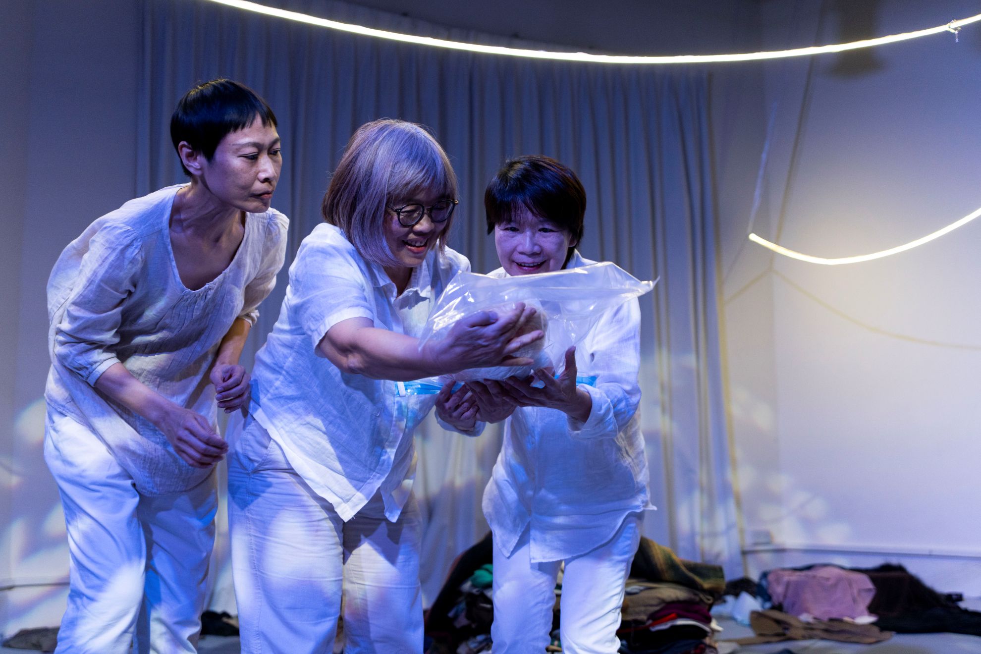 當被抽空的生命,遇上在努力的生命,新的可能開始萌發,至此也讓整個場域與表演都豁然開朗:娃娃、衣物和三名表演者,都是生命中的陪伴者,給予走過低谷的力量,也讓遺物能繼續傳承人生。開場時,主創者薛美華曾出現帶位;演出後段中,她也上台為三位表演者奉茶表達感謝。當演出落幕時,茶杯仍存、陪伴觀演的娃娃們都留在觀眾席上。離開與進駐,從不止息、持續循環。